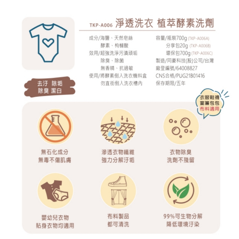 通過SGS檢驗合格不含螢光劑、全磷酸鹽、基酚等有害成份,嬰幼兒及貼身衣物可放心使用,窗簾、包包也可清潔清洗衣物可達到去污 漂白、增艷三效合一,局部污垢可達到乾洗效果,特殊成份可處理衣物染色及避免衣物互染,陳年污垢可配合溫水浸泡以手揉搓可達到清潔效果,有別於傳統化工洗衣粉,專利配方更容易滲透衣物纖維分解污垢,拔除汗垢,顆粒細小易溶解 ,泡沫少 ,不造成殘留,無任何石化及化學原料,通過CNS4986與SGS檢測,可自然生物降解,綠能環保,不刺激皮膚、健康、環保。