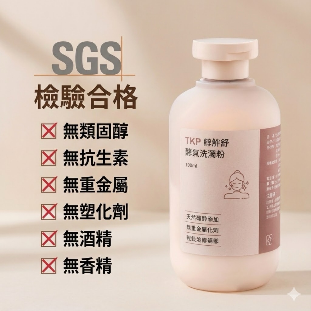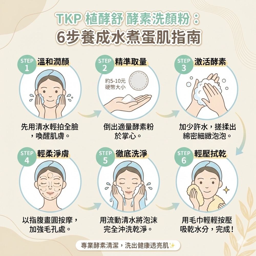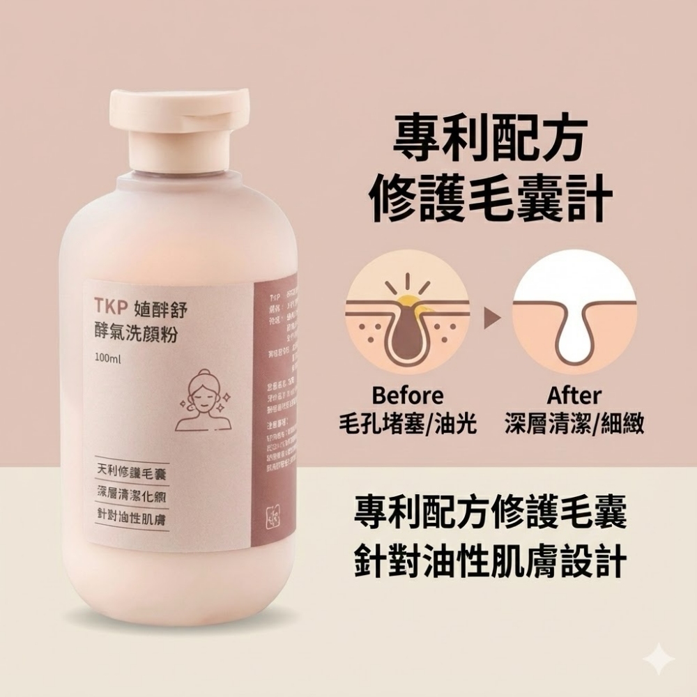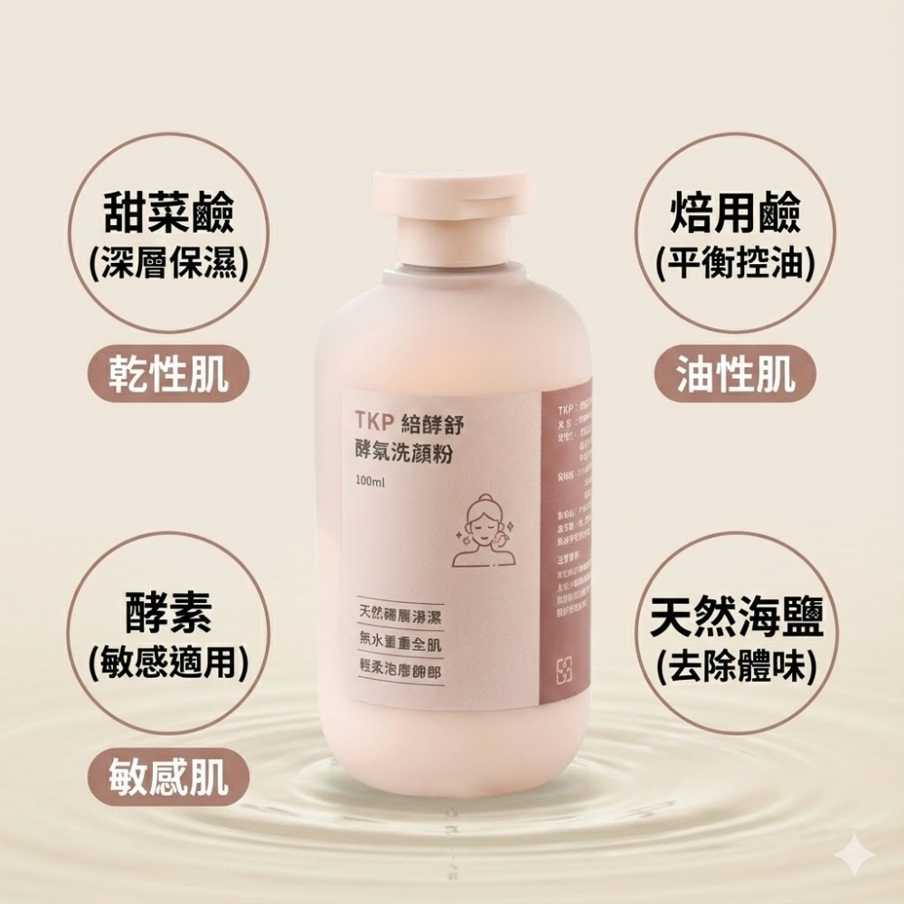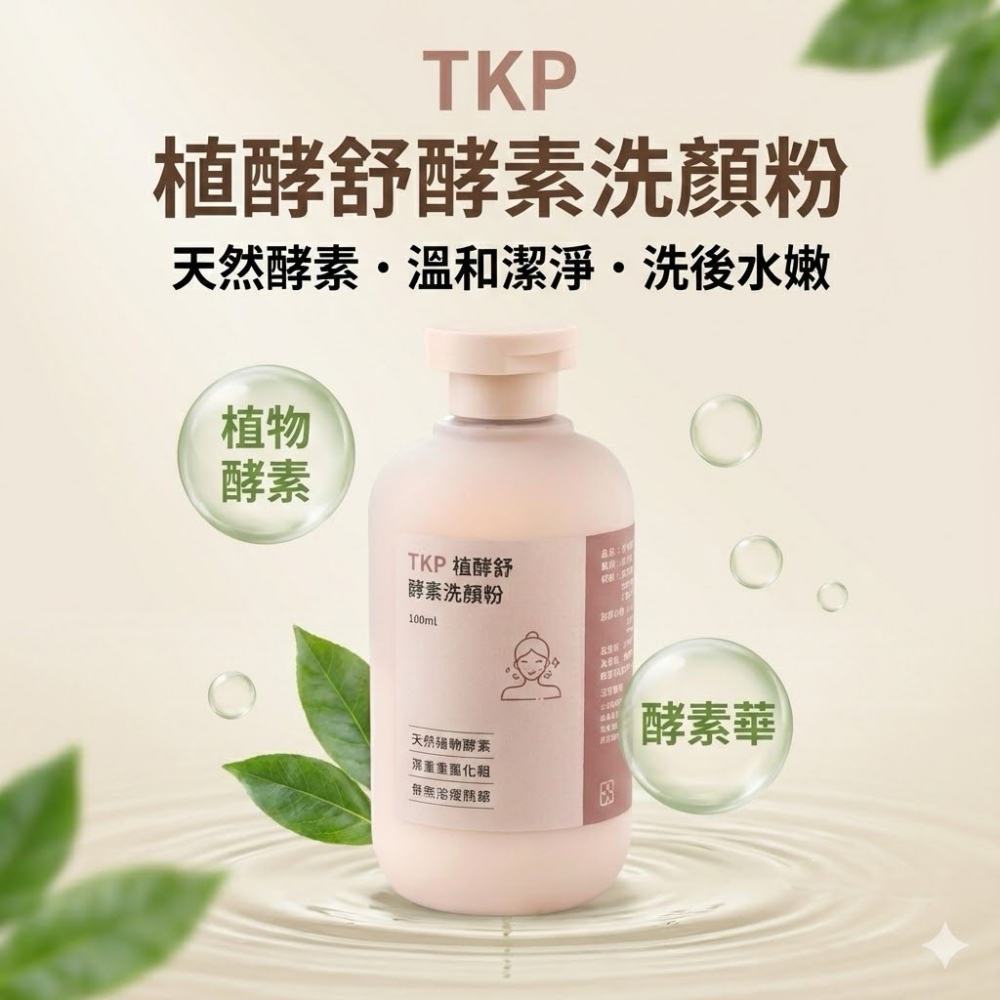 ※使用方式:1.酌量將酵素粉灑於掌心,再加入適當水量。2.將臉部打濕之後,將調配好的洗顏粉置於掌中輕輕按摩臉部即可。【特別說明】油脂分泌旺盛,可清洗兩次,且搭配溫水洗臉,清潔效果更好商品規格品名:TKP植酵舒酵素 洗顏粉(100g)成分:甜菜鹼、枸櫞酸、焙用鹼、酵素、天然海鹽保存期限:五年 製造日期:如包裝打印製造工廠:同豪科技股份有限公司生產地:台灣保存方法:請勿存放在陽光直射及潮濕之處,並應注意置於嬰幼兒無法取得的地方。※環保酵素洗劑沒有使用抗凝結劑,與空氣接觸袋內可能會有些許結塊,輕按即可散開。※因超商取貨有5KG的重量限制.超過需分開下單或改選宅配,謝謝。