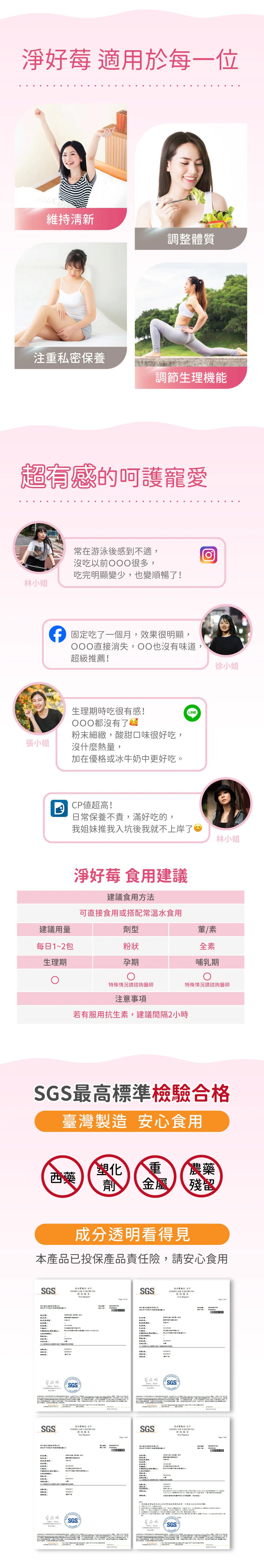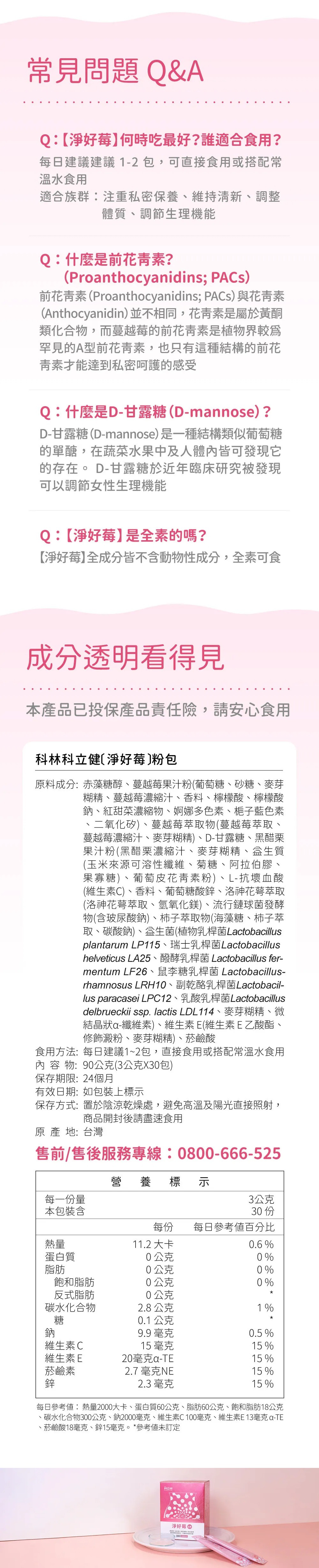 【淨好莓】蔓越莓淨味益生菌擁有莓好女神級的私密呵護★榮獲2025 monde selection肯定☆市售高規前花青素含量 45毫克☆菸鹼素增加黏膜健康,調節女性生理機能☆法國嚴選私密雙植萃 ►蔓越莓萃取物+洛神花萃取物 • 高純度D-甘露糖 • 專利六菌株守護私密 • 專利玻尿酸鈉+鋅 • 菸鹼素增加黏膜健康✴產品定期SGS檢驗 安全品質有保障🔍 常見問題FAQ⭐何謂前花青素?前花青素(PACs) 與花青素(Anthocyanidin)不同。花青素屬於黃酮類化合物,而蔓越莓的前花青素是植物界較為罕見的「A型前花青素」,也只有這種結構的前花青素,才能達到私密呵護的感受。⭐ 【科立健 淨好莓】有什麼特色?淨好莓添加法國專利蔓越莓萃取物,每包含有45毫克以上的前花青素,適合女性的專利益生菌、D-甘露糖、法國洛神花、專利愛宕柿、玻尿酸鈉、維生素C,維持清新,為全方位呵護配方。⭐【淨好莓】建議如何食用?餐前與餐後皆可直接食用或搭配40度以下常溫水服用。每日建議食用量為 1~2 包。⭐【淨好莓】適合誰食用?注重私密保養、維持清新、調整體質、調節生理機能。⭐【淨好莓】需要冷藏保存嗎?置於常溫或陰涼乾燥處保存即可,無需冷藏。開封後請盡快食用。⭐【淨好莓】素食者可以吃嗎?全成分皆不含有動物性成分,全素食者可食用。⭐【淨好莓】食用期間建議?淨好莓屬營養保健食品,建議1~2包,連續服用3個月以上。