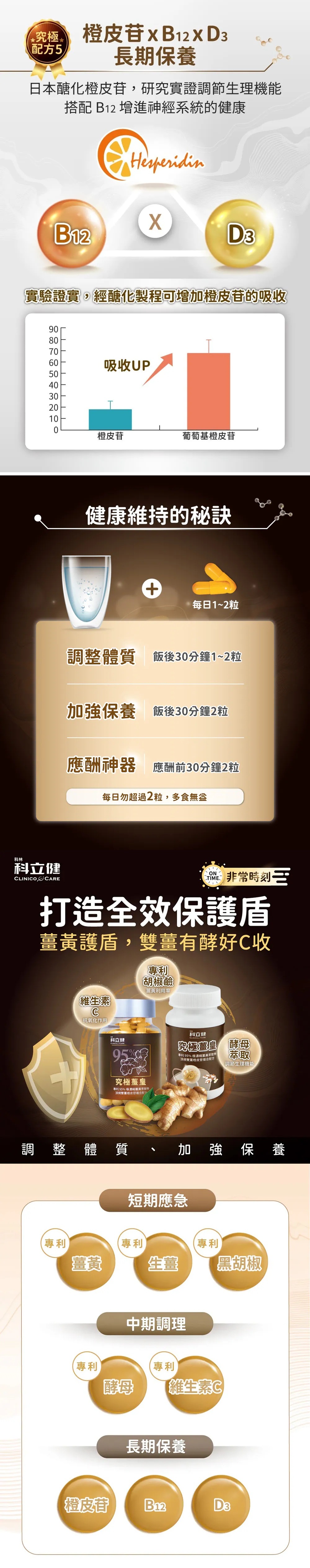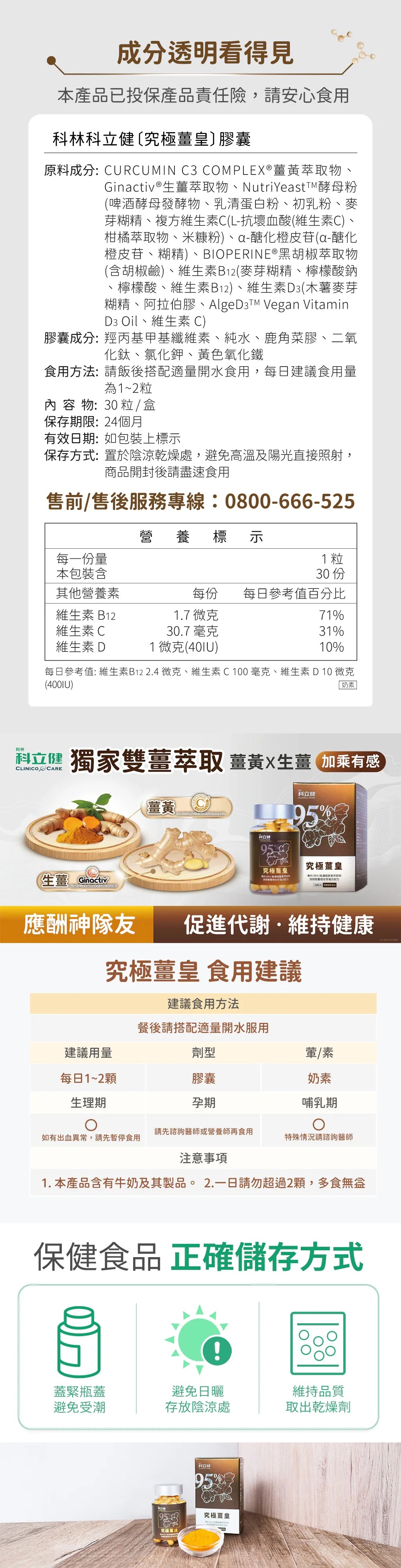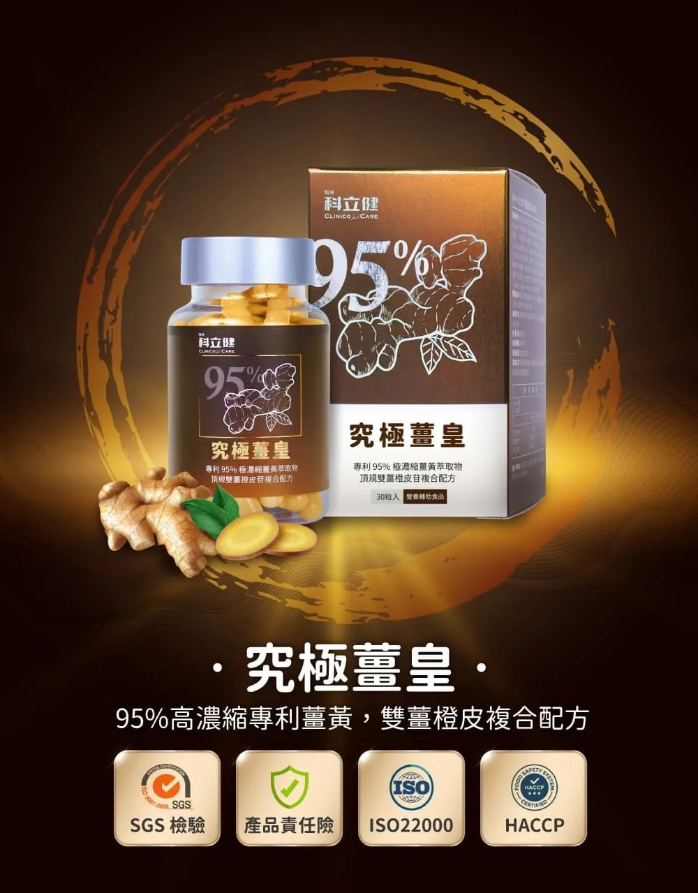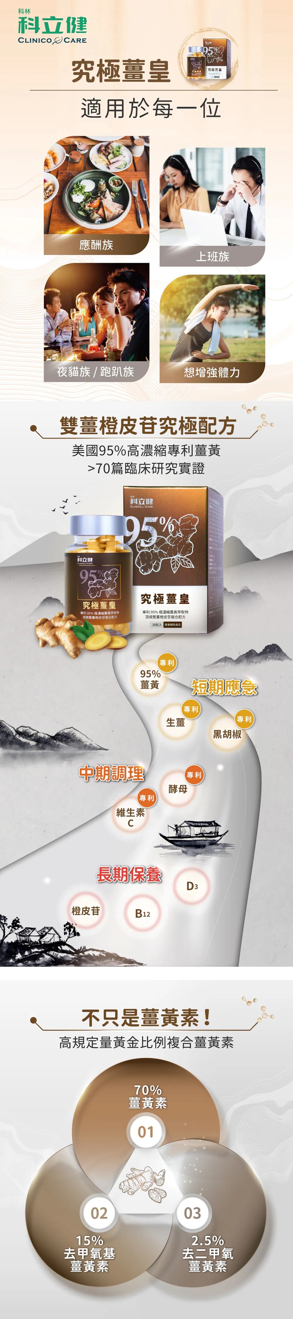 【究極薑皇】美國專利薑黃素雙薑橙皮複合配方 全酵促代謝▪短期應急|95% 美國專利薑黃、PNS生薑▪中期調理|酵母、柑橘異黃酮維生素C▪長期保養|橙皮苷、維生素B12、維生素D☆雙薑橙皮複合配方 應酬熬夜 健康護衛🔍 常見問題FAQ⭐ 「薑黃」與「薑黃素」有什麼不同?薑黃經乾燥後磨成粉末就是常見的薑黃粉,常被用於烹飪調味。而薑黃素則是薑黃中的一種活性成分,具調節生理機能等多種益處。薑黃中的薑黃素非常低,僅含2~5%左右,如果想達到調整體質,建議選擇高濃度的薑黃萃取物作為日常補充。⭐【科立健 究極薑皇】 有什麼特色?究極薑皇嚴選95%高濃度薑黃萃取與PNS專利生薑,雙薑搭配橙皮苷、酵母萃取,添加維生素C具抗氧化作用,維生素B12增進神經系統的健康,幫助調整體質、增強體力,成為應酬良伴。⭐【究極薑皇】建議如何食用?建議餐後搭配常溫水食用1~2顆,或應酬前30分鐘可食用1~2顆。⭐【究極薑皇】適合誰食用?夜貓族、跑趴族、聚餐應酬族、外食族、銀髮族,想增強體力者 ⭐【究極薑皇】素食者可以食用嗎?究極薑皇含牛奶之成分,屬於奶素,純素者請留意。⭐【究極薑皇】食用期間建議?究極薑皇屬營養保健食品,每日建議食用1-2粒,連續服用3個月以上。