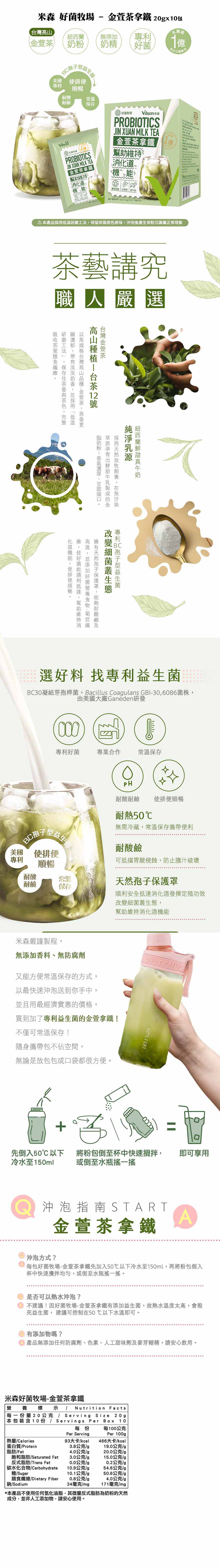 【商品特色】專利好菌促進新陳代謝嚴選台灣高山金萱茶嚴選紐西蘭真牛奶幫助維持消化道機能,使排便順暢堅持不加奶精、麥芽糊精、豆膠等添加物銷售重點【BC孢子型益生菌 X金萱拿鐵奶香】米森選用美國大廠研發BC30凝結芽孢桿菌,其專利好菌耐酸鹼及高溫,可以順利抵達腸道發揮定殖功效,再搭配台灣高山金萱茶及紐西蘭全脂奶粉,淡雅細緻好滋味,促進新陳代謝,幫助維持消化道機能,使排便順暢。