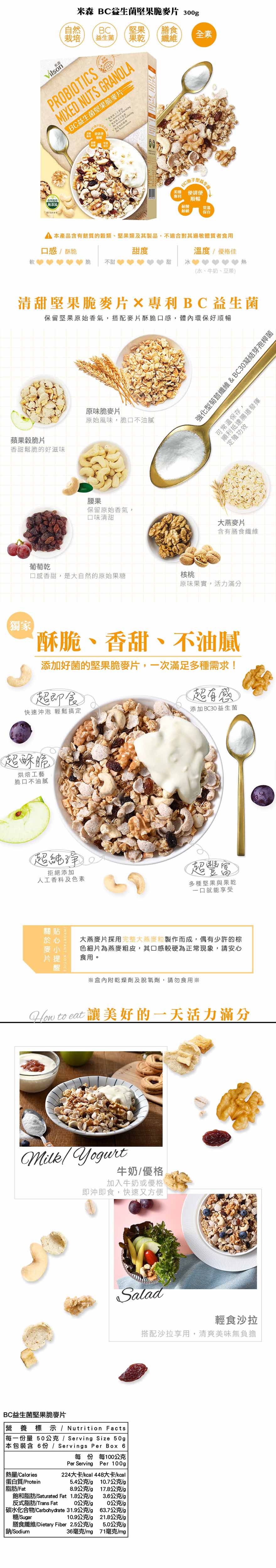 【首創!益生菌x脆麥片】米森特別推出一次滿足2種需求的『益菌脆麥片』嚴選果肉飽滿的核桃&腰果,保留堅果的原始香氣,與脆麥片相互搭配,口感酥脆清甜,再加入BC30凝結芽孢桿菌,就是要超越你對麥片的想像,讓脆麥片再升級!除了酥脆少甜、膳食纖維,還能使排便順暢,每一口都嚐得到真食物的美味!
