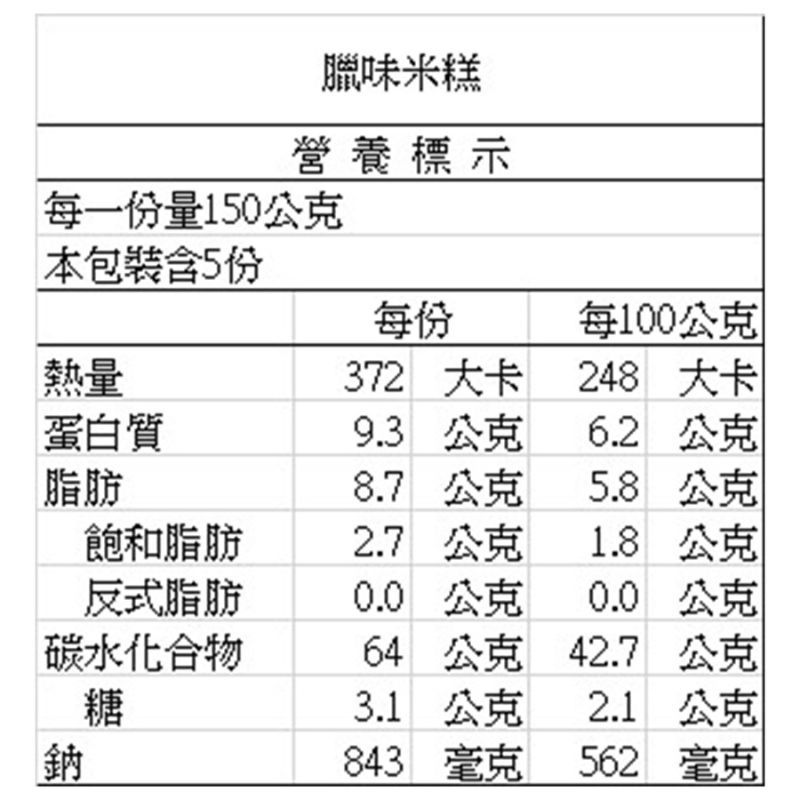 ■內容物成分(全展開),成分有豬及牛的需於背後標註產地: 糯米飯(糯米、水)、水、上等腿肉(台灣)、高粱酒、鹽、糖、亞硝酸鹽、食用色素紅色6號、鴨肝、醬油、蠔汁(蠔、水、鹽)、L-麩酸鈉、羥丙基磷酸二澱粉、小麥澱粉、焦糖色素、紅蔥頭、香豬油(台灣)、香菇、大豆油、豬肉(台灣)、5'-次黃嘌呤核苷磷酸二鈉、5'-鳥嘌呤核苷磷酸二鈉、玉米糖膠、麥粉酥、精製棕櫚油、玉米澱粉(非基因改造)、米、紅麴、精製食用酒精、鹹蛋黃(鴨蛋黃、鹽)、雞肉、軟質棕櫚油、雞油、樹薯澱粉、香料、麥芽糊精、檸檬酸鈉、脂肪酸蔗糖酯、β-胡蘿蔔素、甘草酸銨(甜味劑)、蔗糖素(甜味劑)、蝦、食用色素黃色4號、食用色素紅色40號、糊精、香菇萃取物、胺基乙酸、DL-胺基丙酸、二氧化矽、檸檬酸、蔬菜粉(白蘿蔔、麥芽糊精)、高麗菜粉(高麗菜、麥芽糊精)、琥珀酸二鈉、小茴、胡荽子、肉桂、八角、陳皮、花椒、白胡椒粉