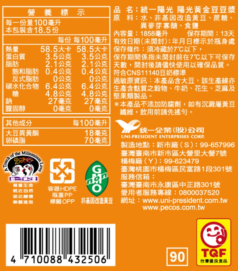 統一陽光陽光黃金豆豆漿1858ml※實際到貨效期約4天以上