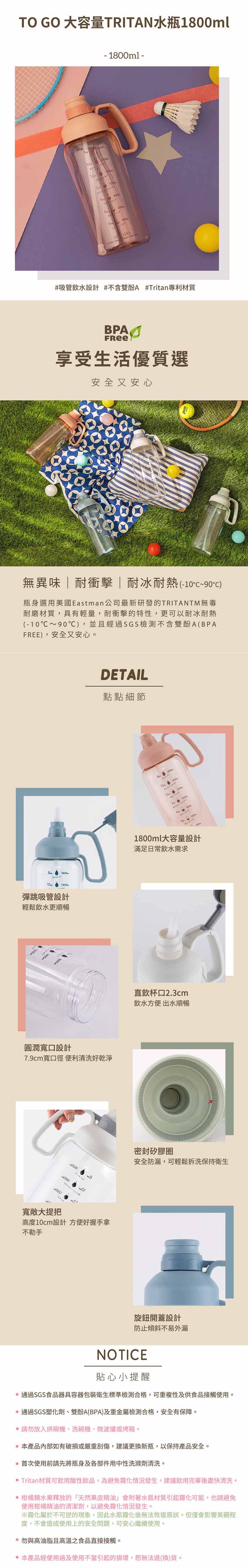 1800ml大容量設計彈跳吸管可輕鬆直飲寬口設計易清洗超潔淨堅固大提把,好握不勒手採用無毒耐磨TRITAN材質