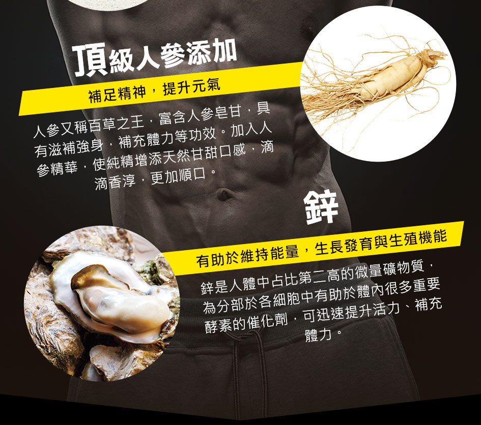 主原料:瑪卡萃取、莧菜萃取、葫蘆巴萃取、人參萃取、瓜拿納萃取、幾丁寡糖 副原料:水、高果糖漿、麥芽糊精、柑橘果膠、香料、葡萄糖酸鋅、DL-蘋果酸、甘草萃、蔗糖素