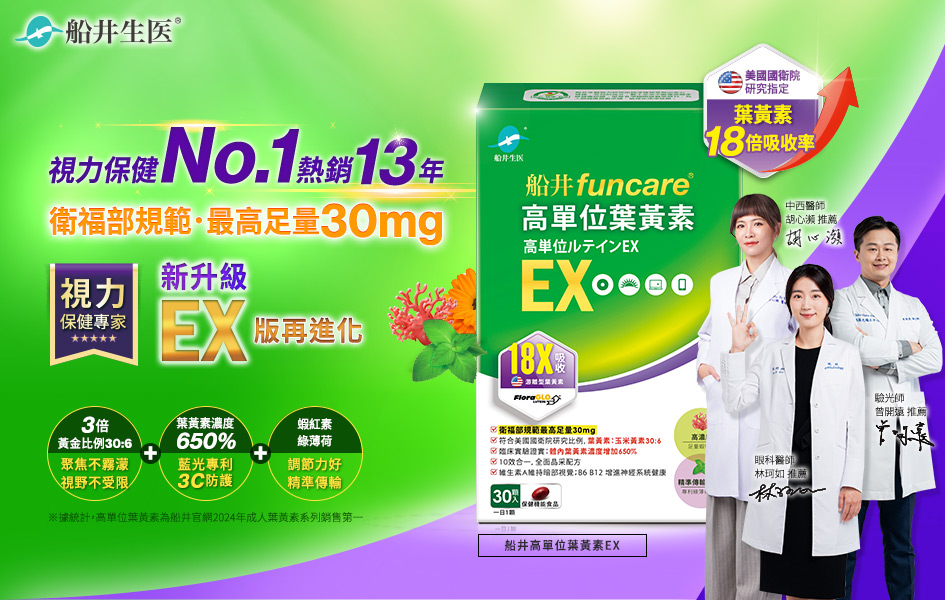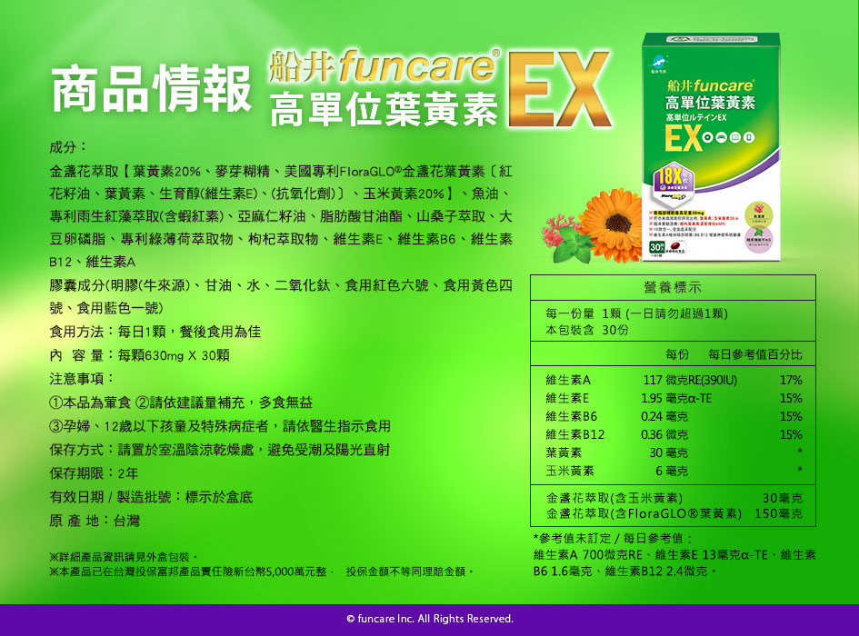 【船井】高單位葉黃素EX 30顆/盒(葉黃素最高劑量30mg/添加蝦紅素、魚油)