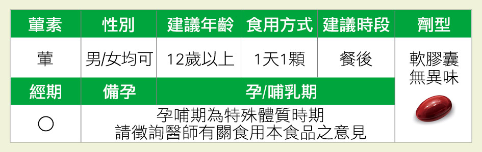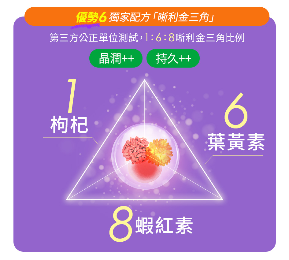 金盞花萃取【葉黃素20%、麥芽糊精、美國專利FloraGLO®金盞花葉黃素〔紅花籽油、葉黃素、生育醇(維生素E)、(抗氧化劑)〕、玉米黃素20%】、魚油、專利雨生紅藻萃取(含蝦紅素)、亞麻仁籽油、脂肪酸甘油酯、山桑子萃取、大豆卵磷脂、專利綠薄荷萃取物、枸杞萃取物、維生素E、維生素B6、維生素B12、維生素A 膠囊成分(明膠(牛來源)、甘油、水、二氧化鈦、食用紅色六號、食用黃色四號、食用藍色一號)