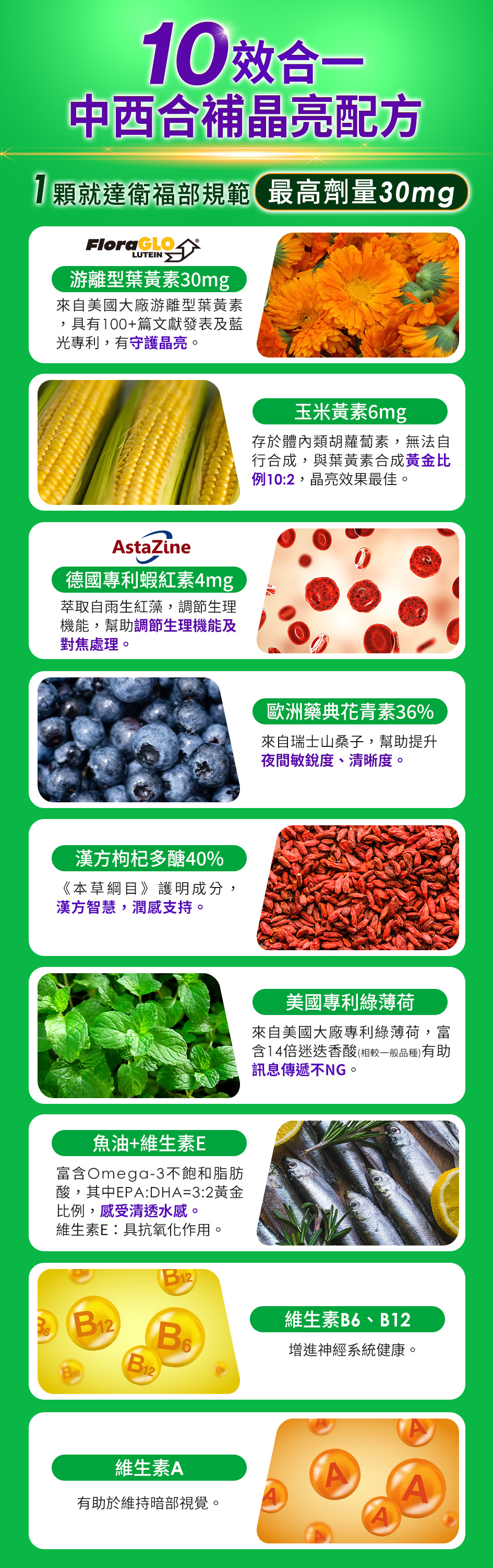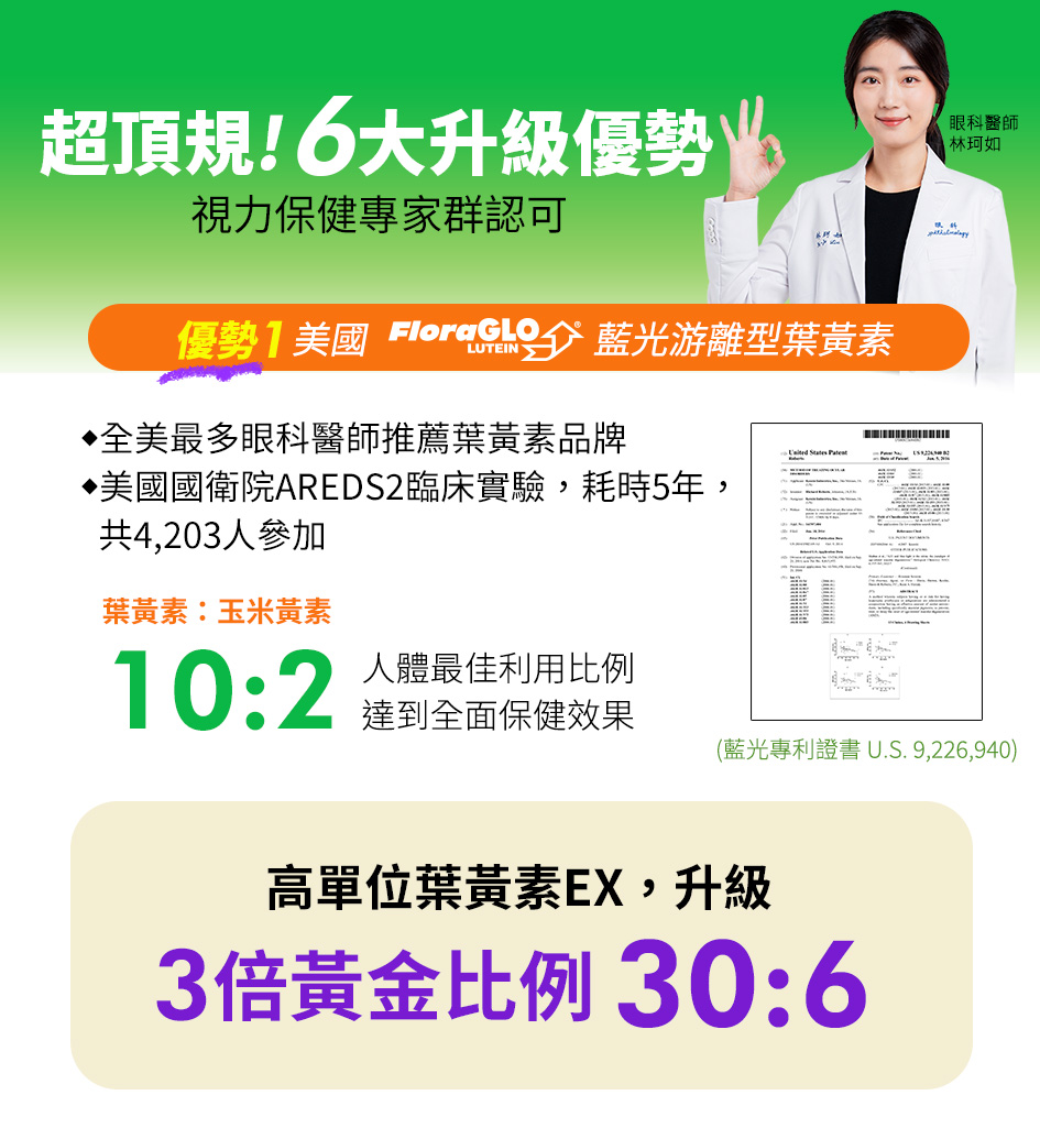 ★高度使用3C、上班族、熟齡族、視力保健必備!. ★成分升級,專利FloraGLO游離型葉黃素+專利玉米黃素 ★德國AstnZine專利蝦紅素、美國專利綠薄荷、歐洲藥典級山桑子+維生素A、魚油+維生素E、漢方枸杞