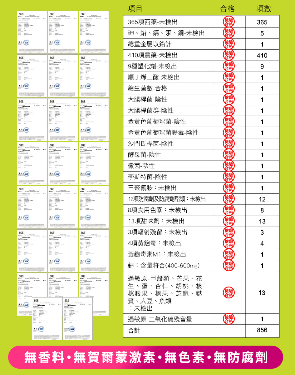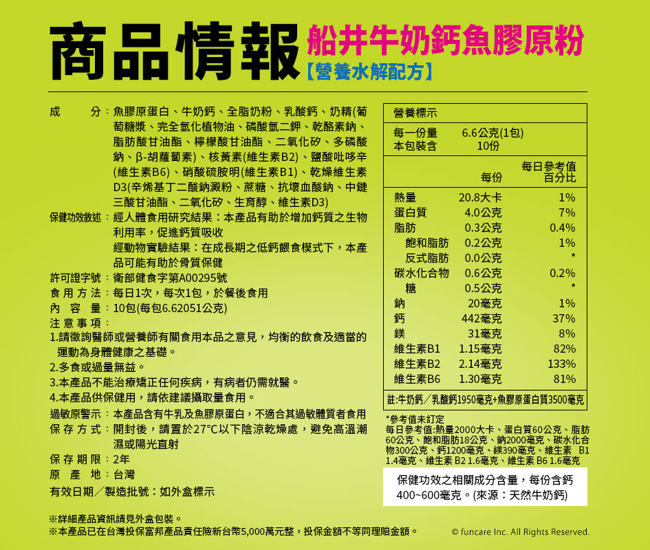 魚膠原蛋白、牛奶鈣、全脂奶粉、乳酸鈣、奶精、維生素 B2、維生素 B6、維生素 B1、乾燥維生素 D3