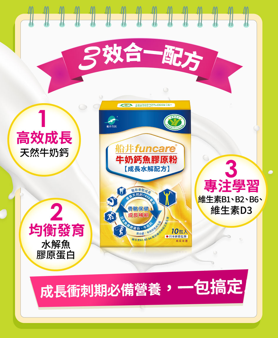 【船井】高成長關健牛奶鈣膠原粉10入/盒x3(骨骼保健X成長補給)