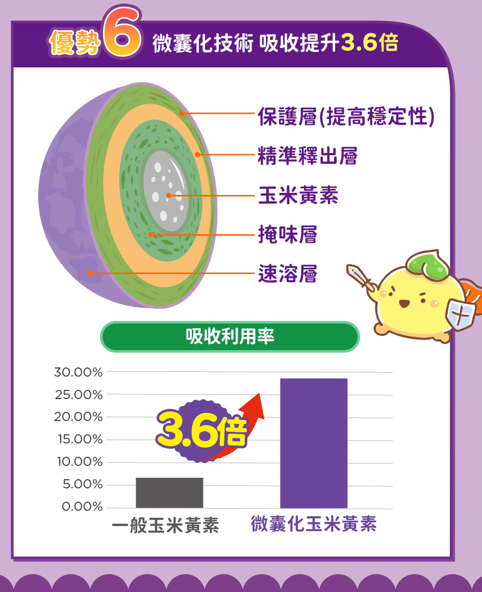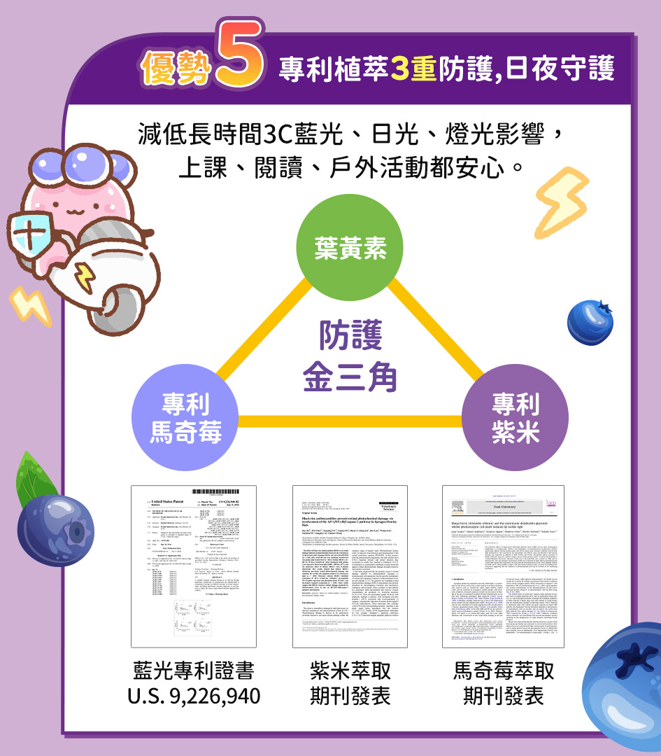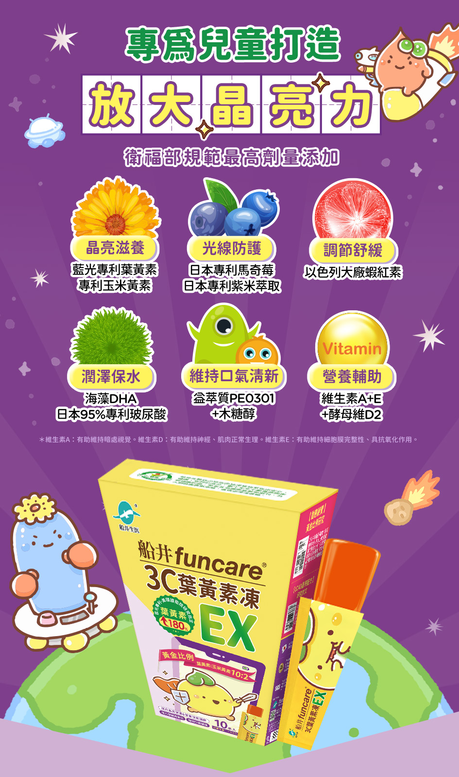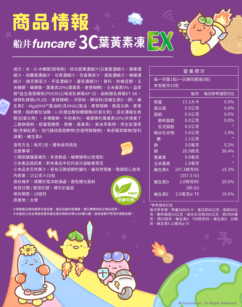 葉黃素20%(葉黃素、麥芽糊精)、玉米黃素5%、益萃質®益生菌發酵粉(PE0301)(唾液乳桿菌AP-32、副乾酪乳桿菌ET-66、植物乳桿菌LPL28)、麥芽糊精)、洋菜粉、酵母粉(含維生素D、硒)、維生素E、AlgaDHA™藻油粉(含DHA)(藻油、麥芽糊精、酪蛋白鈉、麥芽糖漿、脂肪酸甘油酯、L-抗壞血酸棕櫚酸酯(抗氧化劑)、混合濃縮生育醇(抗氧化劑) 、多磷酸鈉、牛奶香料)、美國專利葉黃素10%(辛烯基丁二酸鈉澱粉、乾葡萄糖漿、蔗糖、葉黃素)、紫米萃取物、雨生紅藻萃取(含蝦紅素)、流行鏈球菌發酵物(含透明質酸鈉)、馬奇莓萃取物(智利酒果)、維生素A 副成份:水、D-木糖醇(甜味劑)、綜合蔬果濃縮汁(白葡萄濃縮汁、蘋果濃縮汁、胡蘿蔔濃縮汁、甘蔗濃縮汁、百香果原汁、鳳梨濃縮汁、檸檬濃縮汁、綠花椰菜汁、芹菜濃縮汁、蘆筍濃縮汁)、香料、刺槐豆膠、玉米糖膠、蘋果酸