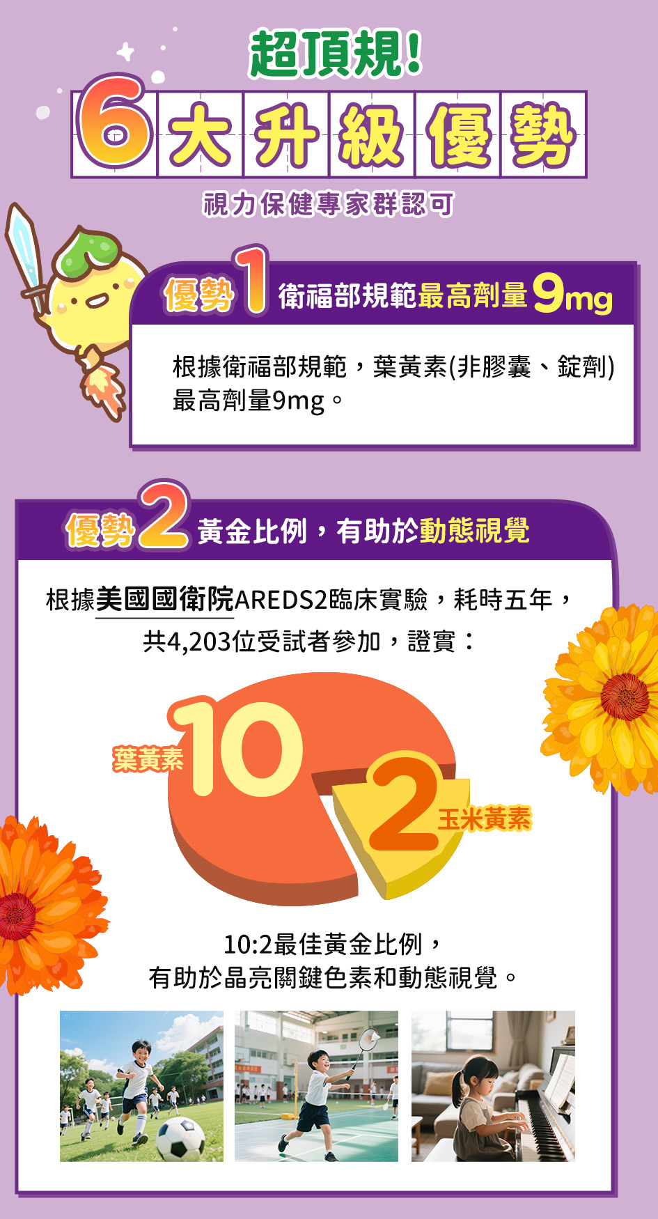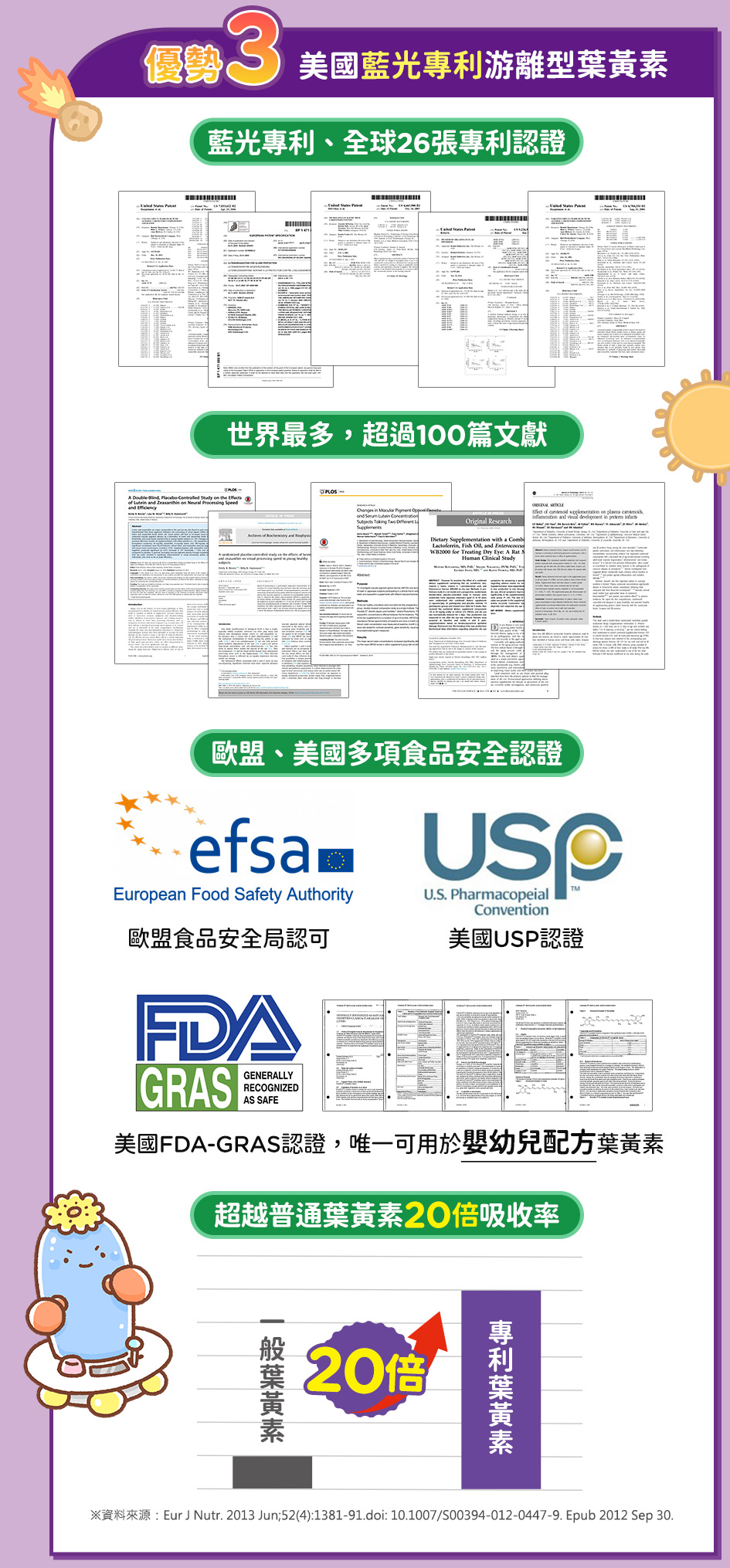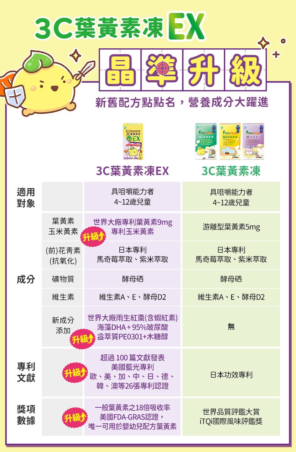 葉黃素20%(葉黃素、麥芽糊精)、玉米黃素5%、益萃質®益生菌發酵粉(PE0301)(唾液乳桿菌AP-32、副乾酪乳桿菌ET-66、植物乳桿菌LPL28)、麥芽糊精)、洋菜粉、酵母粉(含維生素D、硒)、維生素E、AlgaDHA™藻油粉(含DHA)(藻油、麥芽糊精、酪蛋白鈉、麥芽糖漿、脂肪酸甘油酯、L-抗壞血酸棕櫚酸酯(抗氧化劑)、混合濃縮生育醇(抗氧化劑) 、多磷酸鈉、牛奶香料)、美國專利葉黃素10%(辛烯基丁二酸鈉澱粉、乾葡萄糖漿、蔗糖、葉黃素)、紫米萃取物、雨生紅藻萃取(含蝦紅素)、流行鏈球菌發酵物(含透明質酸鈉)、馬奇莓萃取物(智利酒果)、維生素A 副成份:水、D-木糖醇(甜味劑)、綜合蔬果濃縮汁(白葡萄濃縮汁、蘋果濃縮汁、胡蘿蔔濃縮汁、甘蔗濃縮汁、百香果原汁、鳳梨濃縮汁、檸檬濃縮汁、綠花椰菜汁、芹菜濃縮汁、蘆筍濃縮汁)、香料、刺槐豆膠、玉米糖膠、蘋果酸