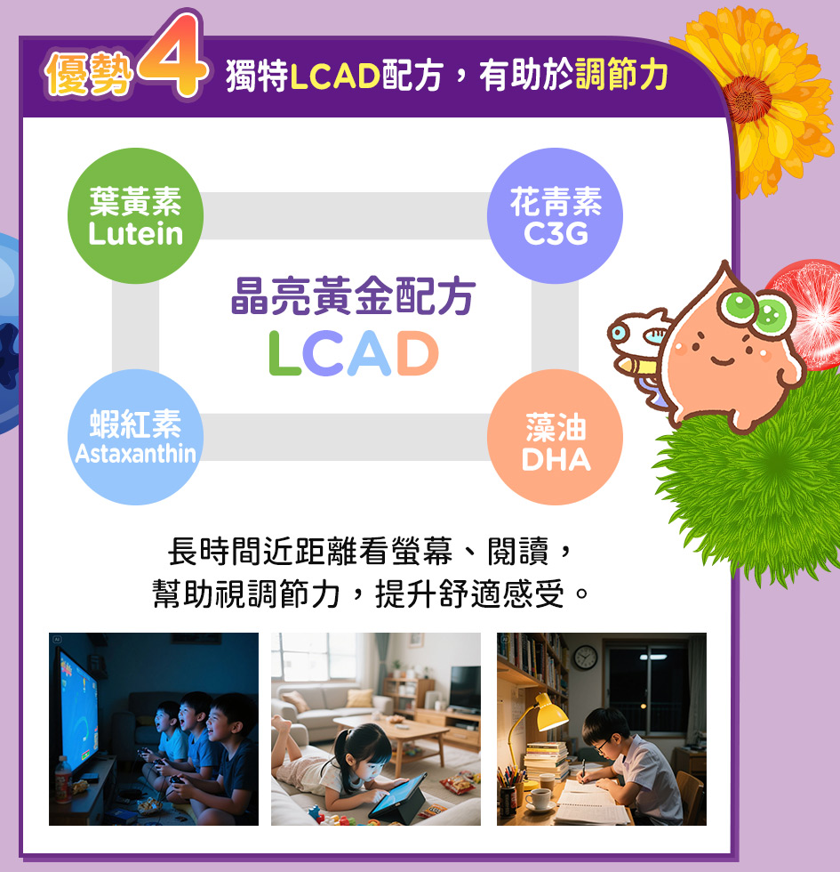 ※產品效期2026/08/03,請盡快食用完畢!!★晶亮升級:葉黃素提升180%,符合衛福部規範最高劑量9mg★ 使用美國藍光專利游離型葉黃素,優於一般葉黃素18倍吸收率★ LCAD晶亮配方(葉黃素+C3G+蝦紅素+DHA ),雙重視覺調節
