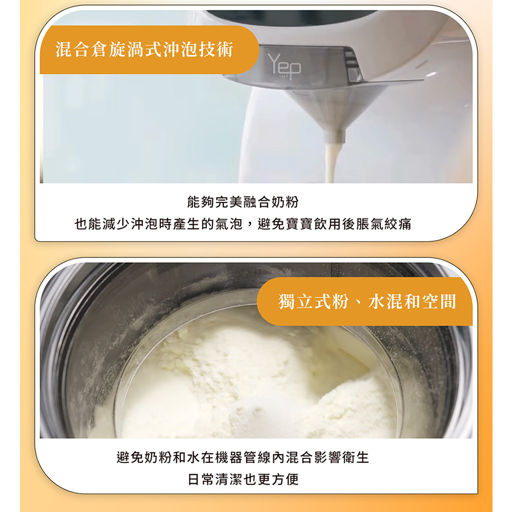 Yep2智能自動泡奶機是一款結合APP操作,可以一鍵控制機器自動泡奶的電器用品,且操作過程只需要一個指令,即可滿足所有泡奶流程,包含熱水控溫、奶粉控量、粉水融合等等步驟,無泡奶需求時也可當作一般智能溫控熱水機使用。避免寶寶在高頻率哭鬧要奶時,繁瑣的傳統泡奶程序讓每位爸爸媽媽焦頭爛額,一機不但輕鬆滿足寶寶一天10-12次的奶量需求,也可以幫助爸爸媽媽極簡化過多的泡奶流程。