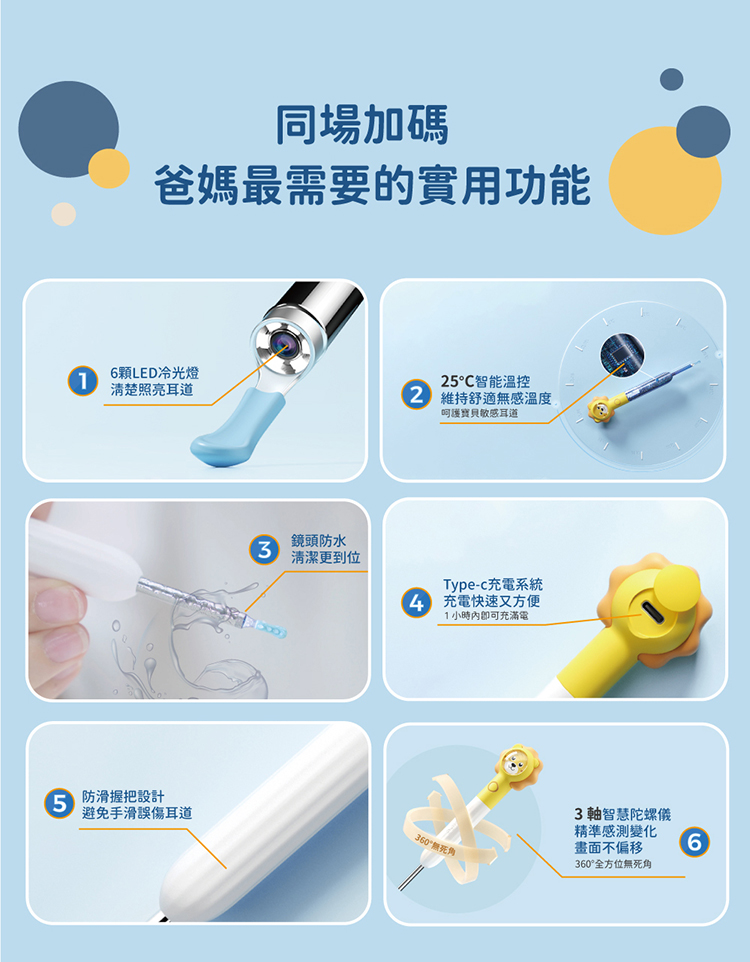 不只如此,鏡頭周圍還安裝了6顆LED亮光燈,能夠清楚照亮完整耳道,采耳過程更安全又快速。