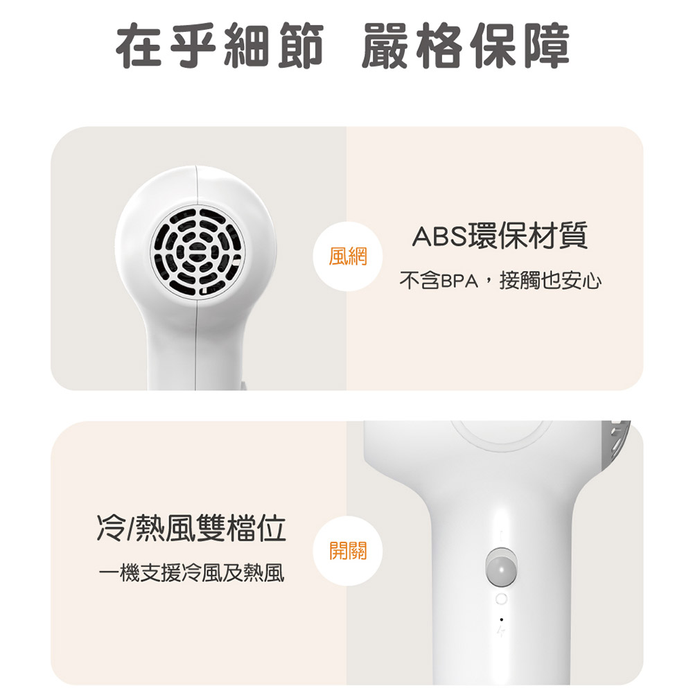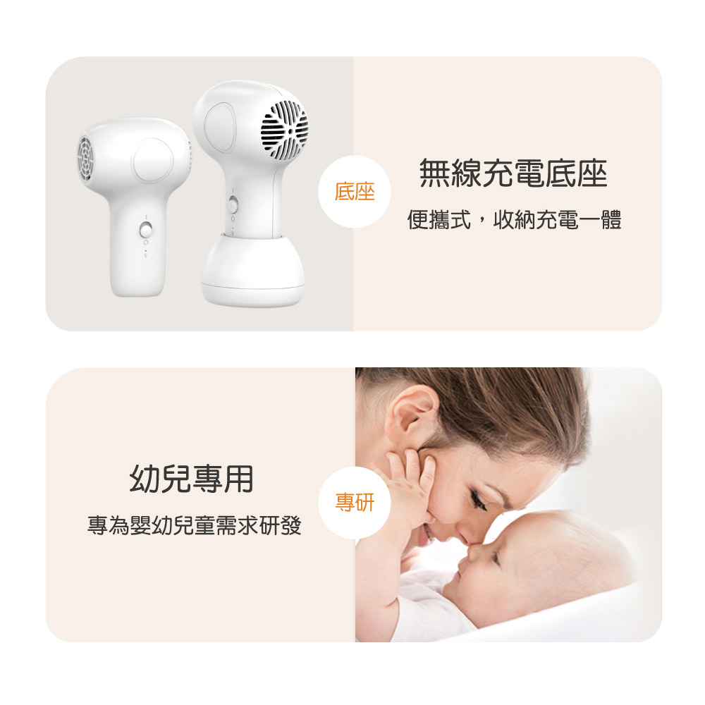 專用的嬰幼兒無線吹風機,輕輕吹乾寶貝幼細柔軟的髮絲、胖嘟嘟的小手臂、