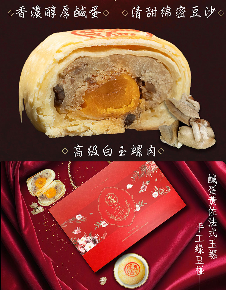 麵粉、奶油、無水奶油、酥油、綠豆沙、豬肉、白玉螺肉、蛋黃