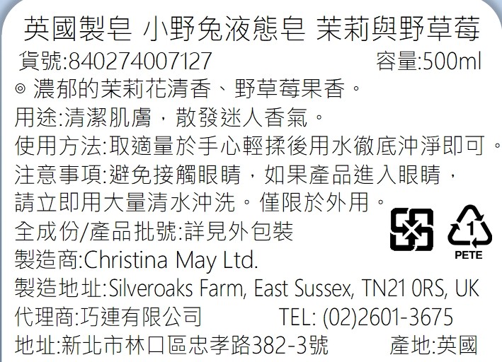 英國製皂-小野兔液態皂 茉莉與野草莓