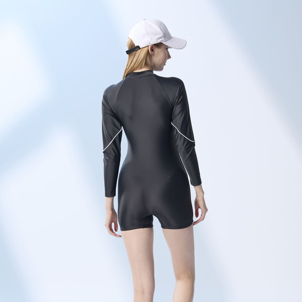 莫妮娜 台灣製 防曬長袖白線全襟立領連身四角泳裝 浮潛必備 黑色