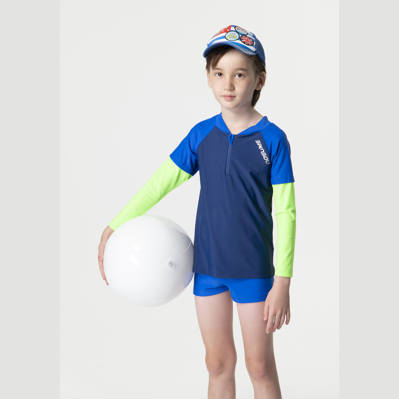 莫妮娜 台灣製 長袖抗UV二件式 泳裝 螢光藍 男女童皆適穿