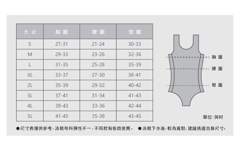 ★模特兒:175CM / 55KG 穿L號 ★此款設計泳裝,游泳戲水前後,可搭配為休閒穿著。 ★材質:聚酯纖維 77% 彈性纖維 23% TOP材質 『泳裝和穿戴型護具配件及內衣褲皆屬私人親膚用品』網路購物的”鑑賞期”非”免費試用期”,下列情形恕不提供退貨服務: • 服飾有明顯使用後磨損痕跡。 • 商品有使用後產生的髒污痕跡或異味(有寵物毛髮、香水味或其他芳香劑味道。 • 商品經過不可恢復之處理,如下水洗滌。 • 商品附屬配件(如罩杯)或贈品缺件。 • 申請退貨服務時,請將商品恢復收貨時原包裝狀況。 • 跨國際訂單如需退換貨而非瑕疵問題,退款時得酌收國際運費。 洗滌方法 請依標卡指示說明清洗 30度水溫洗滌 宜陰乾/不可乾洗/不可漂白/不可烘乾 建議反面放入洗衣袋柔洗或用手輕輕搓揉清洗 商品之樣式及色彩以實物為準 ( 網路上圖片僅供參考 )