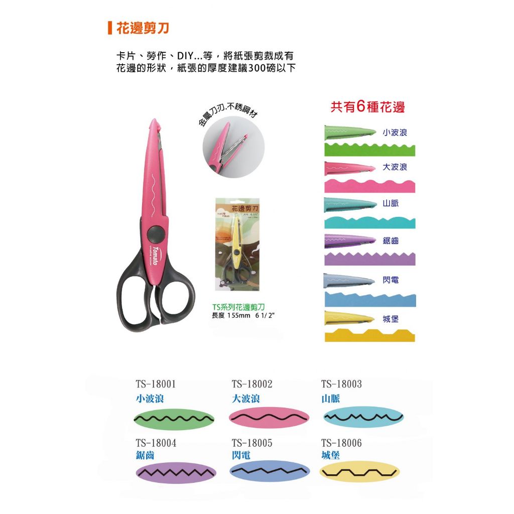 商品介紹:* 6種花邊剪刀* 尺寸:61/2*長度:62mm x 155mm* 金屬刀刃.不銹鋼材.好剪.耐用