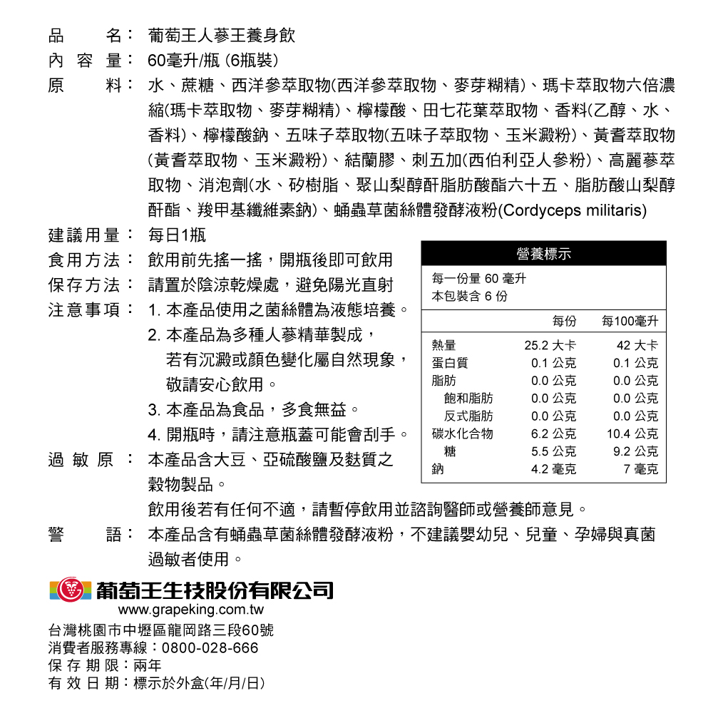 葡萄王人蔘王養身飲60mlx6瓶禮盒