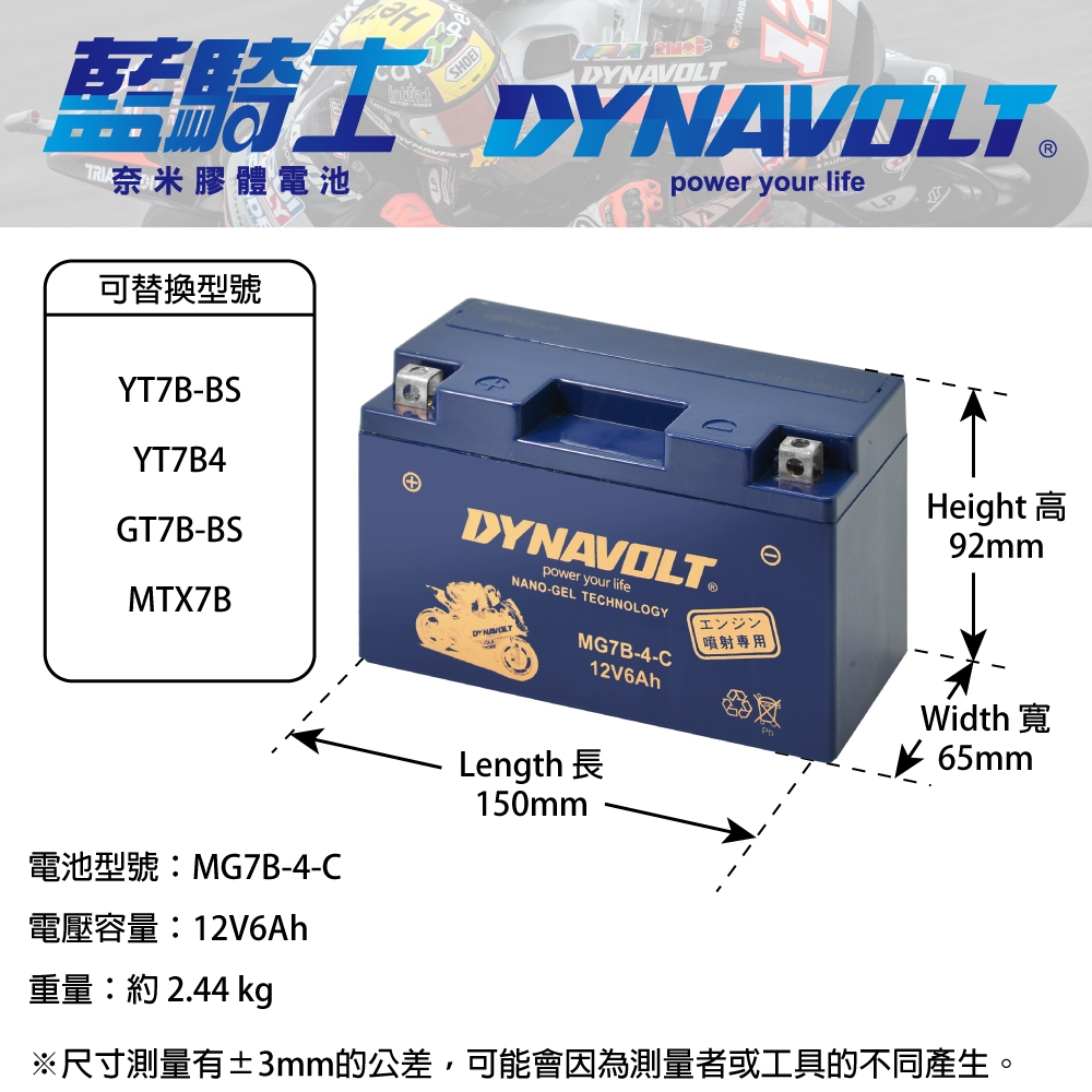 💪為台灣實體店家,產品為全新現貨,如有需求歡迎和我們聊聊喲!✨小叮嚀:如果您不確定愛車應搭配哪種型號的電池,也歡迎詢問喲😊✨全球首創~奈米膠體高能免維護電池GP賽事車手指定電池與日本同步發行銷售支援I-STOP啟停系統【商品規格】DYNAVOLT MODEL : MG7B-4-CSIZE : 長(L) X 寬(W) X 高(H) (mm)150 X 65 X 93 (mm)重量(W) : 約 2.4 kg對應型號:YT7B-BS、GT7B-BS -----------------------------------------✨藍騎士系列 NANO-GEL TECHNOLOGY鉛炭奈米膠體摩托車啟動用蓄電池專為亞洲市場設計開發的高性能、節能型摩托車啟動用蓄電池【商品特色】✨1.支援I-STOP啟停系統✨2.次世代新品 ~獨特奈米膠體電池‧藍騎士系列電池為液態膠體化電池,使用環境溫度範圍廣,無論在高溫或低溫環境下,也能發揮電池性能。✨3.長壽命 ~可承受大充、大放電‧獨特奈米膠體有別於一般鉛酸電池電極板易產生結晶體,並有更高的重量比能量,讓電池的循環使用壽命高於一般鉛酸電池壽命。‧在電極中加入高純度活炭性,電池的充放電接受能力及大電流放電性能大大提高。✨4.高性能 ~低放電性,穩定性高‧自放電率低,為一般鉛酸電池的1.5倍,放置經過一段時間後,當再次使用時,電池仍處於有電狀態。✨5.免維護 ~不用費時保養維護,操作方便‧電池內部會產生酸霧氣體,膠體電池的膠體液會讓酸霧回收還原,保護車體元件不被腐蝕。‧膠體電解液已經注入在電池本體內,購買之後不用自己費時安裝,操作簡單又安全。✨6.安全不漏液的封閉型電池‧電池液的膠體化,抗震性強,環保不漏溢,即使電池本體破損,會將電解液外漏情況抑制到最小。【藍騎士電池重要安裝需知】1. 請確認電池規格與原車配置相同.或大於容量。2. 購買後請於10天內安裝檢測完成.3. 檢測方式:(請使用三用電表.或專業電池檢測儀器) ●安裝前確認電壓:12.7V以上4. 安裝時請先將舊電池依先 正極+ 後 負極- 卸下。 藍騎士依先 負極- ,在 正極+ 安裝於車上,並固定好於車上。 不會因行駛發生跳動現象,避免端子連接鬆動。5. 安裝後務必做上列各項檢測,以避免造成電池過度充電產生外表鼓脹、變形,非正常保固範圍內。A.發動後待速時:12.9V~13.5V(開大燈時) B.油門加置RPM 2000~3000轉時,電壓:13.5V~14.5V C.請勿超過電壓15V以上6.膠體電池與一般鉛酸電池保養方式相同。7.建議由專業人員進行安裝測試。8.購買7天後若商品需要檢測維修,由消費者負擔寄送運費。9.若為人為因素造成將不在保固範圍內,將酌收檢測維修費。10.建議電池未使用狀況下每個月定期保養充電。 -----------------------------------------------------------------------光陽機車(KYMCO)CHERRY 50豪邁FILLY 50KIWI 50豪邁FILLY 80豪邁80MAN BOY 90YOUNG UP 90GOING 100IDOL 100TOP BOY 100豪邁得意100SO EASY 100金翔鶴100翔鷹100得意100新得意100翔羚100愛的100KIWI 100CHERRY 100如意100三陽機車(SYM)風50MIO 50X PRO R1 50高手 X PRO 50風50 EFI(五期)MIO 50 EFI(五期)恰恰 CHA CHA 90風動90JET 100SMILE心情100風動100風100新PARTY生活100飛馳100MIO 100極速高手100X PRO R1 100WOWOW 100(復古車新金旺100 EFI(五期)風梭110FNX 125山葉機車(YAMAHA)VINO 50(五期水冷四行程)VINO 90JOG 90美的90RS 100BWS 100CUXI 100小丸子100大兜風100JOQ 100SUPER FOUR 100RSZ 100(四期環保)JOQ SWEET 100CIAO 110CUXI 115LIMI 115JOG FS 115JOG SWEET 115勁豪125台鈴機車(SUZUKI)歐風50赢家50莎士比亞50新貴50歐風100赢家100星艦100新鋒100金贏家100星河100莎士比亞100DR 250RG500 Gamma比雅久機車(PGO)LLPMX90HOT90飛將90MY BUBU 100產品保固◆本產品提供保固一年◆保固說明:CSP進煌保證所販售的商品均為正常新品,出貨前均已經過完整測試,確定商品安全無誤後,才運送寄出。運送過程安全嚴謹,品質保證。◆保固期內,若因人為操作或其他因素造成商品故障損壞,來回運費需消費者自行處理,謝謝!◆保證除外:1.未遵守保養或任意改裝2. 連接電池方向接反而引起本產品燒燬安裝前請先熟讀安裝須知※若造成電池膨脹或過放電為個人使用不當造成,非保固範圍內。-----------------------------------------------------------------------#奈米膠體電池 #機車電瓶 #重機電池 #12V #6AH #三陽SANGYANG #台灣山葉 #Mio50EFi #風50EFi #WOWOW(復古車)100 #GUXI #WOWOW100EFi #新金旺100Efi