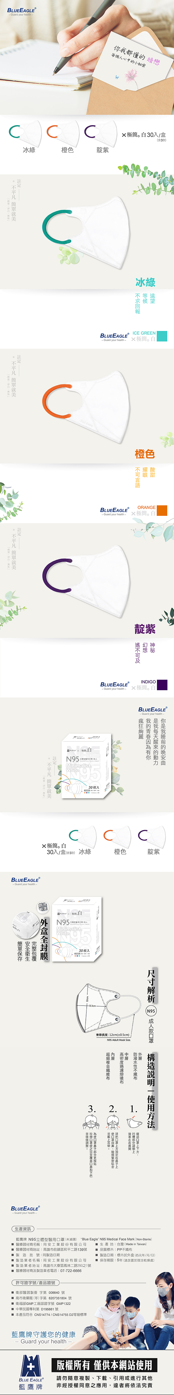 【商品規格】商品名稱:藍鷹牌 N95立體型醫用口罩(未滅菌)商品廠牌:藍鷹牌(Blue Eagle)商品型號:NP-3DMKBB-30商品顏色:口罩|黑色,耳帶|曜綠、酒紅、靛紫製造商名稱:同安工業股份有限公司(大寮廠)製造商電話:07-7226666製造商地址:高雄市大寮區鳳林二路293之1號商品原產地:台灣(Made in Taiwan)主要材料:PP不織布販售數量:每色10入共30片/盒製造日期:請詳見產品包裝標示(製造日期會因庫存批次而有所不同)【醫療器材許可證】◆核定品名:藍鷹牌N95立體型醫用口罩(未滅菌)◆核准字號:衛部醫器製壹字第 006640 號◆藥商名稱:同安工業股份有限公司◆製造廠名稱:同安工業股份有限公司◆製造廠地址:高雄市大寮區鳳林二路293之1號◆製造廠電話:07-722-6666【藥商許可執照】◆許可執照字號:高市衛藥販(苓)字第 6207351804 號◆藥商名稱:醫碩科技股份有限公司◆藥商地址:高雄市苓雅區和平二路474號◆藥商電話:07-722-5500【注意事項】1.商品展示圖因每台電腦螢幕設定差異顏色會略有不同,以實際商品顏色為準2.保存及配戴本產品,請遠離火源3.請勿洗滌本產品4.本品受潮或受污染時,請立即停止使用5.當配戴不舒服或呼吸困難時,請立即停止使用6.建議連續配戴時間不超過8小時