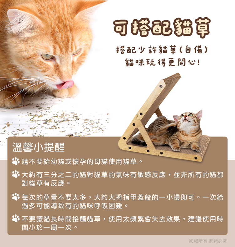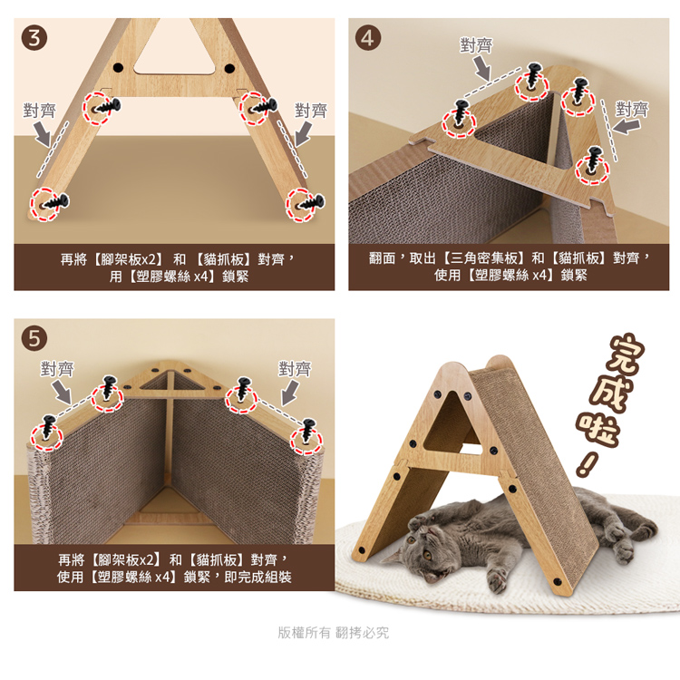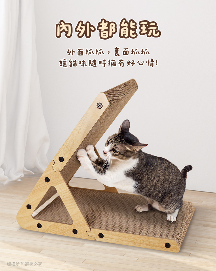 貓本屋 A型立式貓抓板★內2面+外2面,四面可抓★ --高密度瓦楞紙+密集板,A型可任意翻面-- 高密度瓦楞紙板製造,環保可回收,可爬可抓玩累了還可躺進屋內,玩樂與休息合而為一! 裏2面+外2面,四面皆為貓抓板,隨時磨爪,穩固不怕壓,讓大貓小貓都可玩翻天! 注意事項: .本商品為接觸型商品,為避免傳染性疾病(如:跳蚤/壁蝨/疥癬…等) 一經開封或試用過,恕不受理更換事宜。.購買前仔細詳閱商品規格尺寸,慎重購買,以免造成日後買賣糾紛。.抓板屬於瓦楞紙製品,在製作上由於裁剪工藝的原因,難免會有些許 切割裁剪留下的痕跡,屬正常情況非瑕疵!.本產品僅供寵物使用,禁止兒童攀爬,以免造成危險。.所有的規格與重量皆採手工測量,誤差±3%屬正常範圍。 轉載敬告: 鈞嵐(立嵐)之商品圖文、影片或商標等,皆屬鈞嵐(立嵐)版權所有, 若未經同意即任意轉載刊登者,我司將進行相關智慧財產著作權與 商標權及商業法的追訴權利。 商品規格: .型 號:OO-P-SB31.品 名:貓本屋 A型立式貓抓板.款 式:木紋.尺 寸:約 25.6 x 44.6 x 41.5 cm ±5%.重 量:約 870 g ±5%.材 質:密集板、瓦楞紙、塑料.包裝內含:三角型板 x2、腳架板 x4、貓抓板 x2、 螺絲起子 x1、塑膠尖頭螺絲 x16 .商品保固:僅限新品瑕疵更可換商品.產 地:中國大陸
