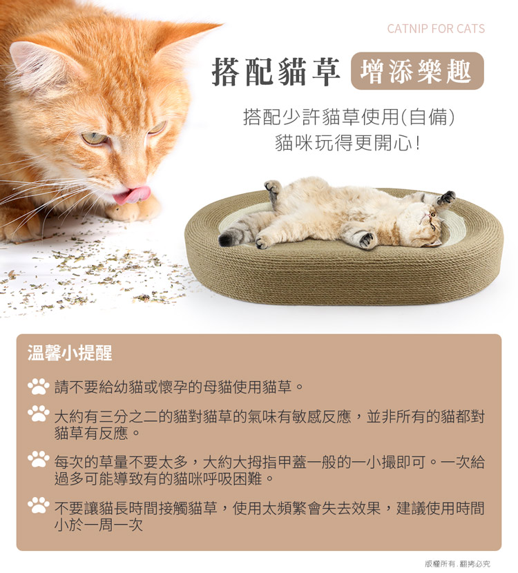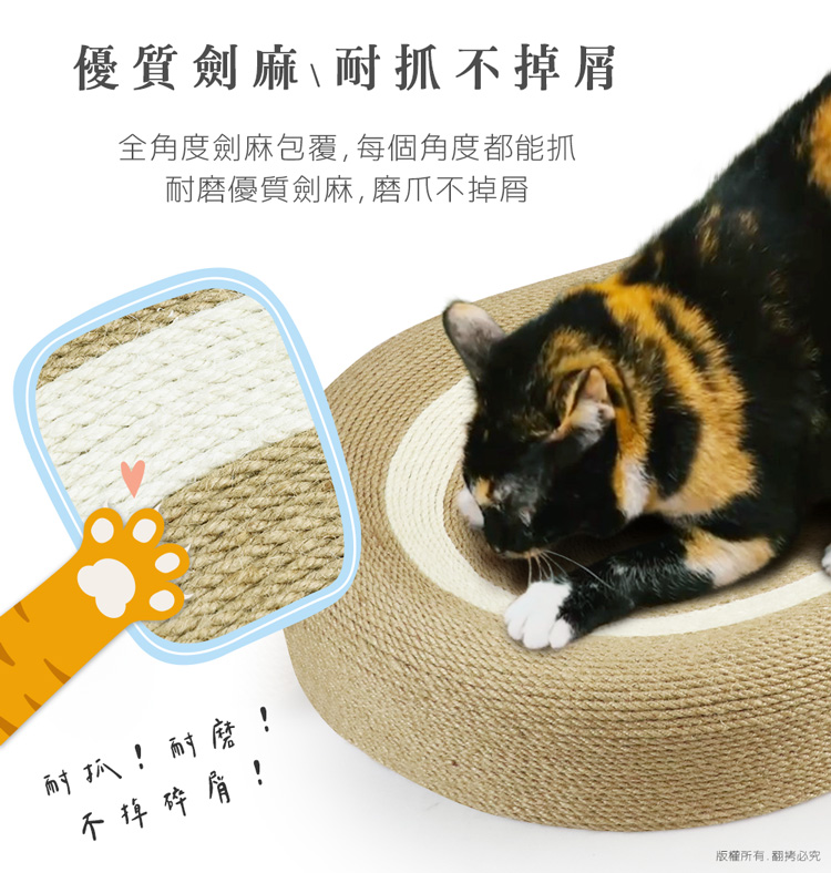正面採用優質劍麻全包覆設計,耐抓耐磨不易掉碎屑,採用漸近式下凹弧型,可貼合貓咪身型,讓貓主子舒適躺臥,零重力睡眠,安全感滿分。