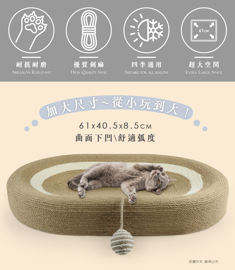61cm加大SIZE,肥貓無慮肆意翻躺,從小貓玩到大貓,全齡貓適用側邊備有鈴鐺劍麻玩具球,讓貓咪自娛自嗨,快樂一整天! 注意事項: .本商品為接觸型商品,為避免傳染性疾病(如:跳蚤/壁虱/疥癬…等) 一經開封或試用過,恕不受理更換事宜。.購買前仔細詳閱商品規格尺寸,慎重購買,以免造成日後買賣糾紛。.所有的規格與重量皆採手工測量,誤差±5%屬正常範圍。 轉載警示: 自民國108年6月1日起(含追溯既往),鈞嵐(立嵐)企業有限公司之 商品圖片、影片或鈞嵐(立嵐)企業有限公司文字及LOGO, 任何客戶或用戶需轉載刊登任何圖片、文字、影片 皆需經過鈞嵐(立嵐)書面同意,如有需求請與鈞嵐(立嵐)客服中心接洽聯絡。 若任何未經鈞嵐(立嵐)同意即任意轉載刊登者, 我司將進行相關智慧財產著作權與商標權及商業法的追訴權利。 商品規格: .型 號:OO-P-SB13.品 名:貓本屋 特大號劍麻貓抓板貓窩.尺 寸:約 61 x 40.5 x 8.5 cm ±5%.重 量:約 819 g.材 質:劍麻繩、紡織物、板料布、聚酯纖維.包裝內含:劍麻貓抓板貓窩 x1.商品保固:僅限新品瑕疪更可換商品.產 地:中國大陸