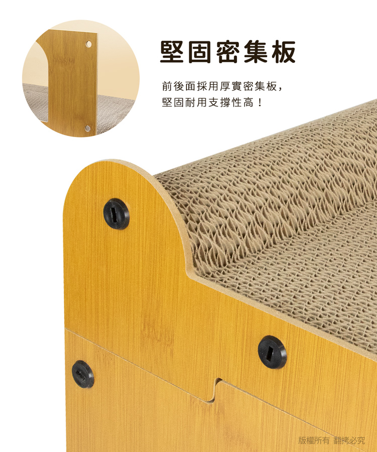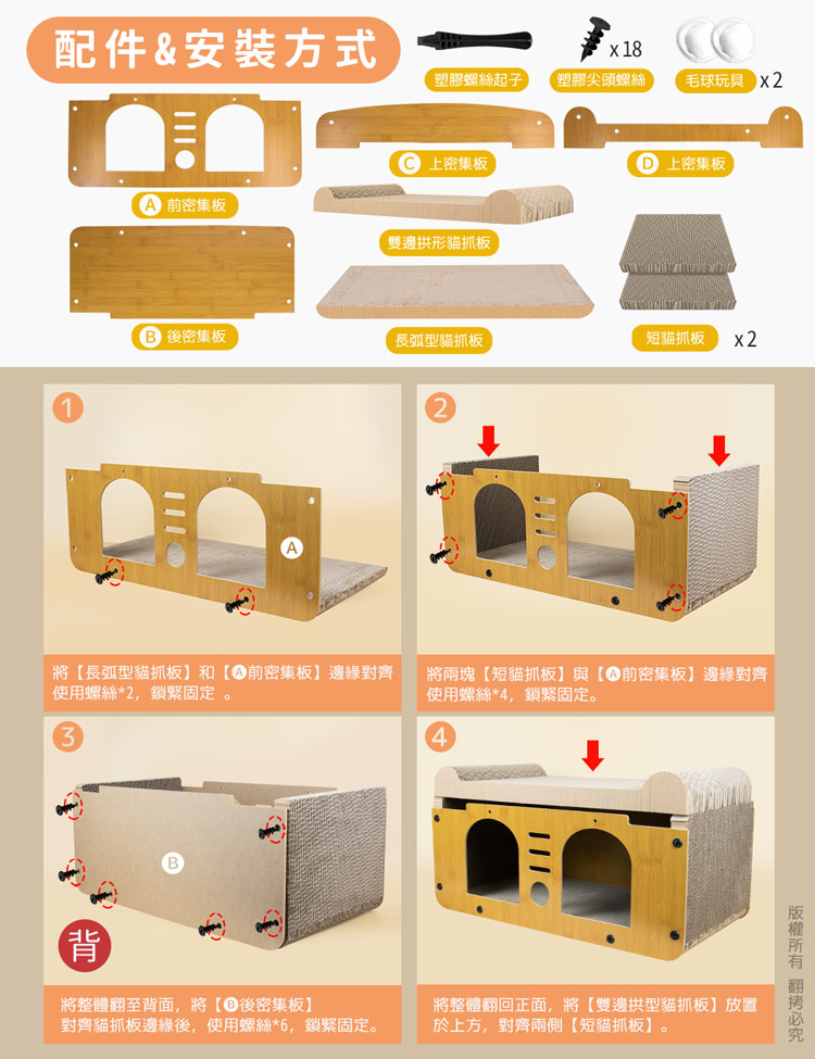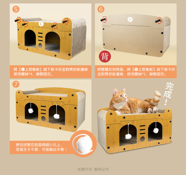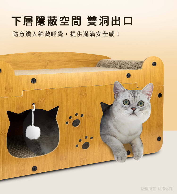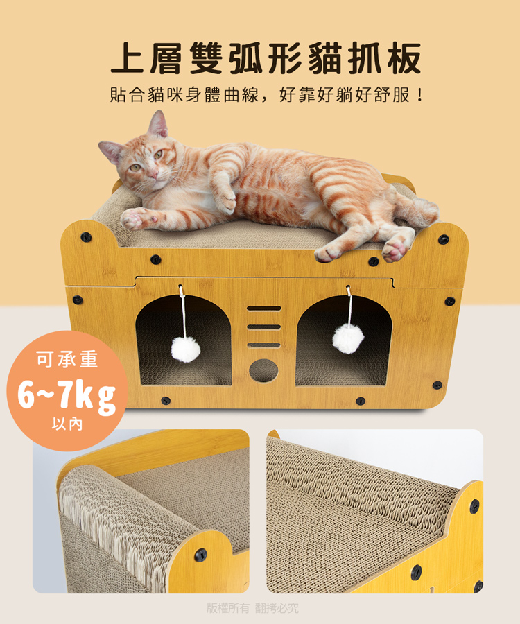 貓本屋 輕奢華雙層雙洞口 貓抓板貓屋 ★貓主子喜歡的都在這★ --磨爪休息兩不誤,臥躺無憂,適於全齡貓----攀爬式設計+多面貓抓板+躲藏空間-- 愛玩是貓的天性,而磨爪子會讓牠們感到開心!喜歡躲入小箱子內,喜歡爬上爬下的到處奔跑~雙洞口設計,方便窺探,同時俱備透氣與隱密性,前後面板採用密集板設計,結構緊密牢固耐用! 給愛玩的貓咪磨爪子滿足天性!是兼具動與靜多功能的設計,不論是喜歡躲藏的,還是懶洋洋的貓主子,都是值得入手的必備好物!立刻讓貓咪擁有一個可以玩樂/磨抓/休息的地方! 注意事項: .玩具毛球顏色為隨機搭配!.本商品為接觸型商品,為避免傳染性疾病(如:跳蚤/壁虱/疥癬…等) 一經開封或試用過,恕不受理更換事宜。.請遠離高溫源(如:暖氣、火爐…等),以免不慎點燃。.請避免放置於水源或是水氣多的地方,避免瓦楞紙與密集板受潮。.本產品僅供寵物使用,請勿做其他用途。.此商品內附的瓦楞紙屬於紙製品,在製作上由於裁剪工藝的原因,難免 會有些許切割裁剪留下的痕跡,屬正常情況非瑕疪!.購買前仔細詳閱商品規格尺寸,慎重購買,以免造成日後買賣糾紛。.本產品僅用於寵物使用,切勿用於其他用途。.商品圖檔顏色因電腦螢幕設定差異會略有不同,以實際商品顏色為準。.尺寸與重量皆採手工測量,±5%誤差屬正常範圍。 轉載警示: 自民國108年6月1日起(含追溯既往),鈞嵐(立嵐)企業有限公司之 商品圖片、影片或鈞嵐(立嵐)企業有限公司文字及LOGO, 任何客戶或用戶需轉載刊登任何圖片、文字、影片 皆需經過鈞嵐(立嵐)書面同意,如有需求請與鈞嵐(立嵐)客服中心接洽聯絡。 若任何未經鈞嵐(立嵐)同意即任意轉載刊登者, 我司將進行相關智慧財產著作權與商標權及商業法的追訴權利。 商品規格: .型 號:OO-P-SB17 .品 名:貓本屋 輕奢華雙層雙洞口 貓抓板貓屋.款 式:雙貓頭款/雙門款 .整體尺寸:約 28 x 56 x 32.5 cm (±5%).重 量:約 1975 g (±5%).材 質:瓦楞紙、密集板、塑料.隨附配件:雙邊拱形貓抓板 x1、長弧型貓抓板 x1、短貓抓板 x2 密集板 x4、毛球玩具 x2、塑膠螺絲起子 x1 塑膠尖頭螺絲 x18 、貓草(小包) x1.商品保固:僅限新品瑕疪更可換商品.產 地:中國大陸