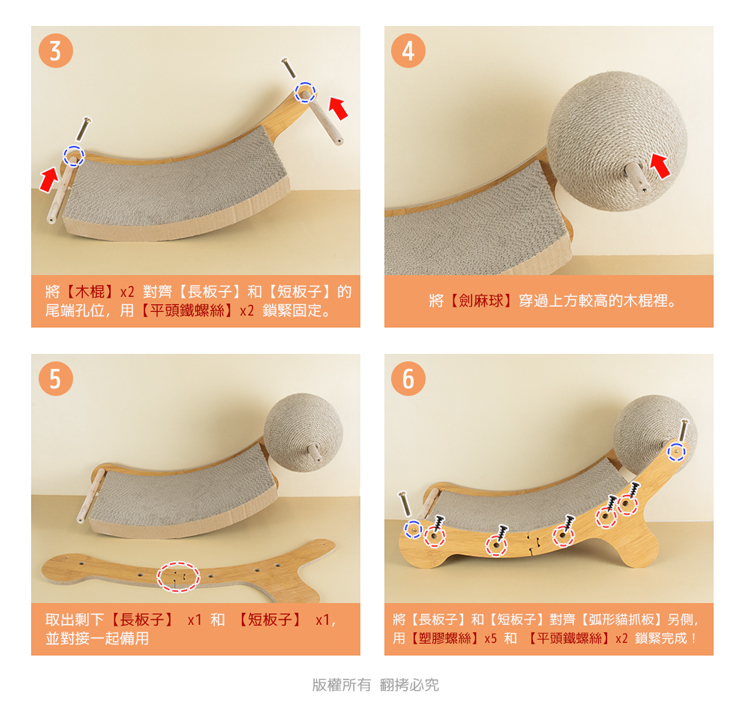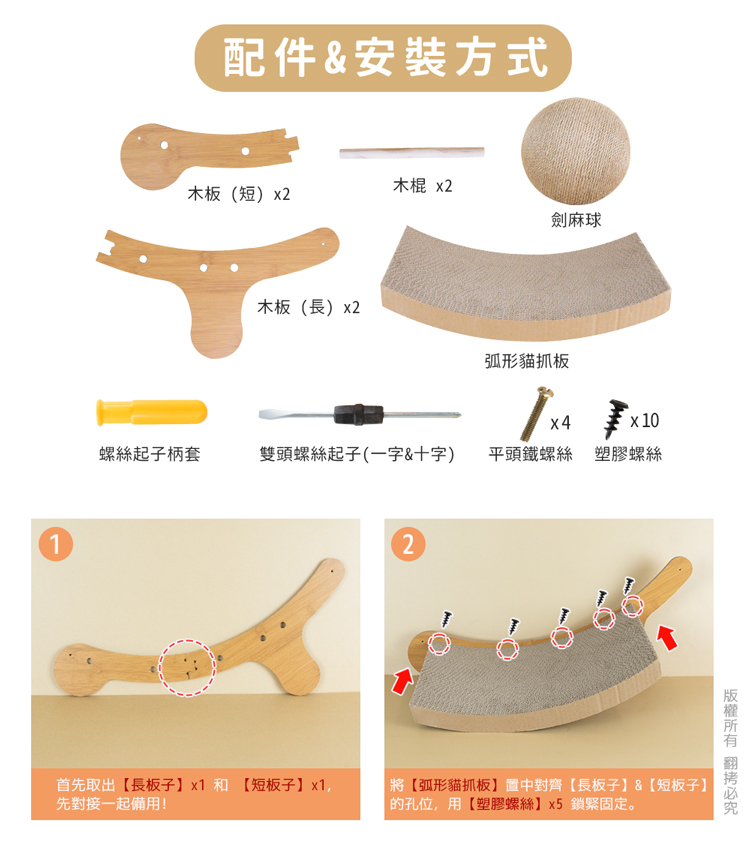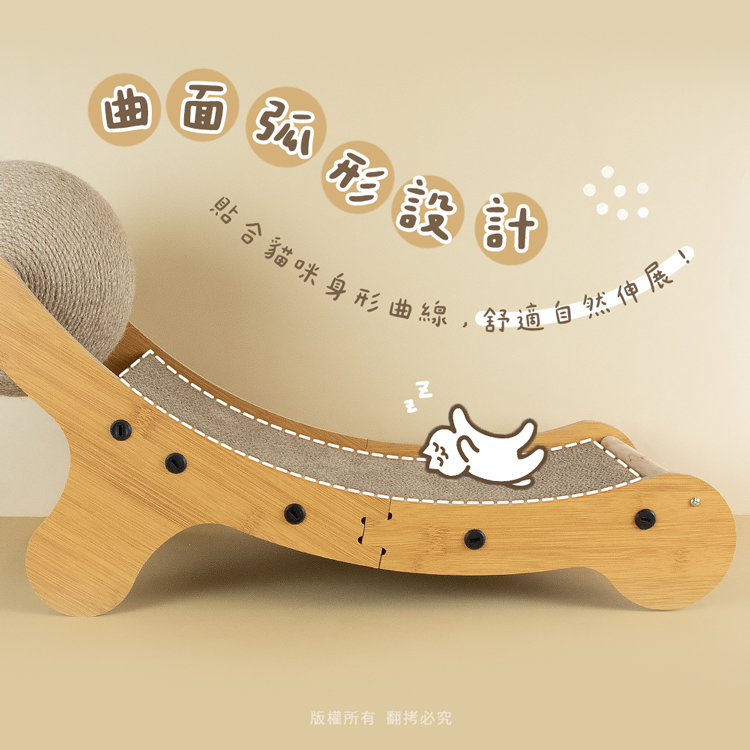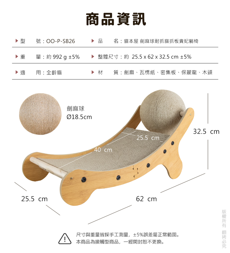 貓本屋 劍麻球耐抓貓抓板貴妃躺椅★適用全齡貓★ -- 磨爪玩樂,臥躺無憂,耐玩劍麻繩球 ---- 弧形高密度貓抓板,好躺好抓,可替換設計 -- 愛玩是貓的天性,而磨爪子會讓牠們感到開心!緊密劍麻繩球,任由貓咪轉動抓玩,盡情釋放天性!曲面弧形抓板設計(可替換),貼合貓咪身體曲線,舒適自然伸展。 採用密集板材+木棍,結構緊密牢固耐用!高密度貓抓板,可供貓咪磨爪。給愛玩的貓咪磨爪子滿足天性!是兼具動與靜多功能的設計,立刻讓貓咪擁有一個可以玩樂/磨爪/睡覺的好物! 注意事項: .本商品為接觸型商品,為避免傳染性疾病(如:跳蚤/壁蝨/疥癬…等) 一經開封或試用過,恕不受理更換事宜。.請遠離高溫源(如:暖氣、火爐…等),以免不慎點燃。.請避免放置於水源或是水氣多的地方,避免瓦楞紙與密集板受潮。.本產品僅供寵物使用,請勿做其他用途。.此商品內附的瓦楞紙屬顧紙製品,在製作上由於裁剪工藝的原因,難免 會有些許切割裁剪留下的痕跡,屬正常情況非瑕疵!.購買前仔細詳閱商品規格尺寸,慎重購買,以免造成日後買賣糾紛。.商品圖檔顏色因電腦螢幕設定差異會略有不同,以實際商品顏色為準。.尺寸與重量皆採手工測量,±5%誤差屬正常範圍。 轉載敬告: 鈞嵐(立嵐)之商品圖文、影片或商標等,皆屬鈞嵐(立嵐)版權所有, 若未經同意即任意轉載刊登者,我司將進行相關智慧財產著作權與 商標權及商業法的追訴權利。 商品規格: .型 號:OO-P-SB26.品 名:貓本屋 劍麻球耐抓貓抓板貴妃躺椅.尺 寸:約 25.5 x 62 x 32.5 cm (±5%/最大外徑).球體直徑:約 Ø18.5 cm.重 量:約 992 g (±5%).貓 抓 板:約 24.5 x 40 x 3 cm / 約 318 g .材 質:劍麻、瓦楞紙、密集板、保麗龍、木頭、塑料.隨附配件:木板(長) x2、木板(短) x2、木棍 x2、劍麻球 x1、 塑膠螺絲 x10、平頭鐵螺絲 x4、螺絲起子 x1、螺絲起子柄套 x1.商品保固:僅限新品瑕疵更可換商品.產 地:中國大陸