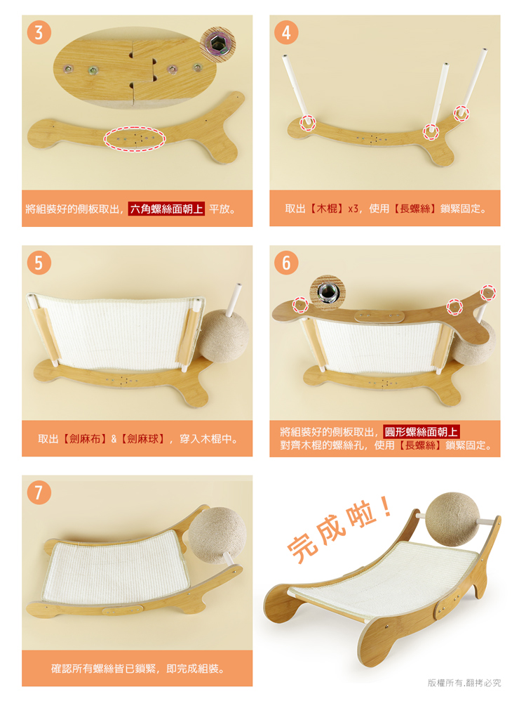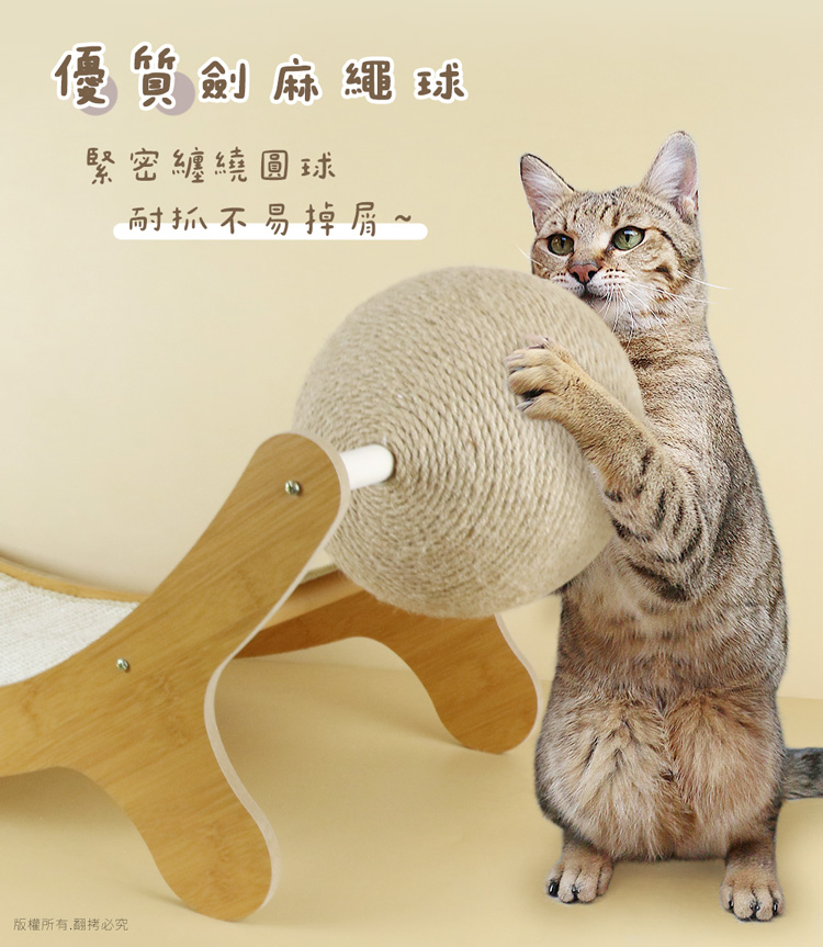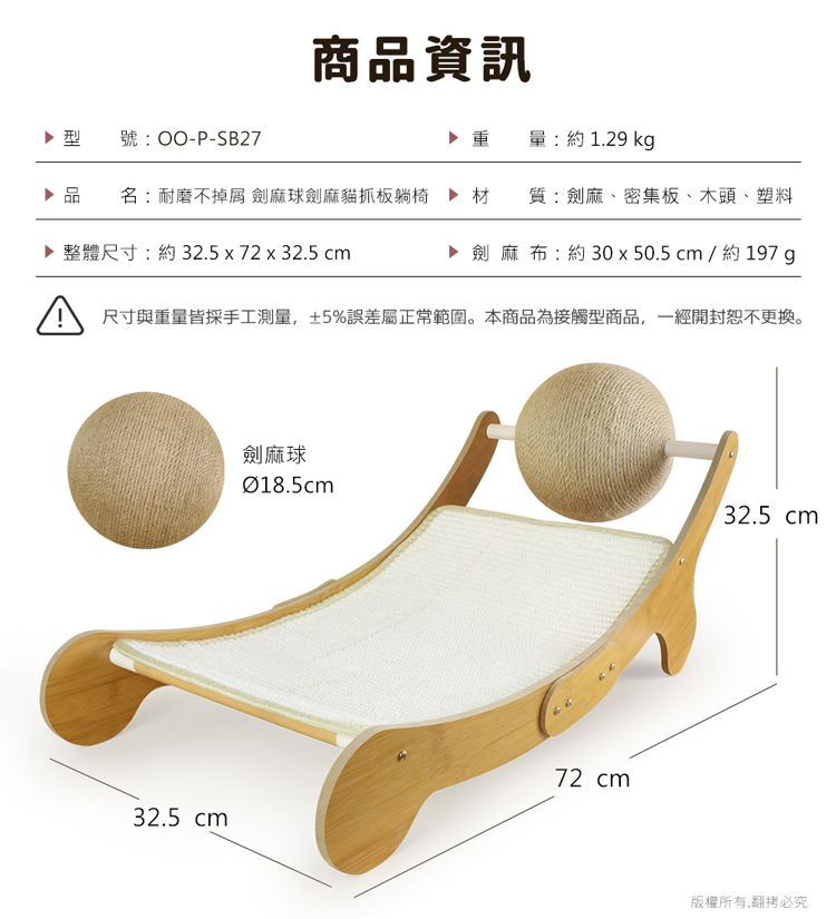 貓本屋 耐磨不掉屑 劍麻球劍麻貓抓板躺椅 -- 磨爪玩樂,臥躺無憂,耐玩劍麻繩球,適於全齡貓---- 優質編織劍麻布,可替換設計,耐抓不掉屑 -- 愛玩是貓的天性,而磨爪子會讓牠們感到開心!緊密劍麻繩球,任由貓咪轉動抓玩,盡情釋放天性!曲面劍麻布(可替換),貼合貓咪身體曲線,舒適自然伸展。 採用厚實密集板搭配木棍設計,結構緊密牢固耐用!劍麻繩摩天輪球與緊密編織劍麻布,可供貓咪磨爪。給愛玩的貓咪磨爪子滿足天性!是兼具動與靜多功能的設計,立刻讓貓咪擁有一個可以玩樂/磨爪/睡覺的好物!注意事項: .本商品為接觸型商品,為避免傳染性疾病(如:跳蚤/壁蝨/疥癬…等) 一經開封或試用過,恕不受理更換事宜。.請遠離高溫源(如:暖氣、火爐…等),以免不慎點燃。.請避免放置於水源或是水氣多的地方,避免密集板受潮。.本產品僅供寵物使用,請勿做其他用途。.購買前仔細詳閱商品規格尺寸,慎重購買,以免造成日後買賣糾紛。.商品圖檔顏色因電腦螢幕設定差異會略有不同,以實際商品顏色為準。.尺寸與重量皆採手工測量,±5%誤差屬正常範圍。 轉載敬告: 鈞嵐(立嵐)之商品圖文、影片或商標等,皆屬鈞嵐(立嵐)版權所有, 若未經同意即任意轉載刊登者,我司將進行相關智慧財產著作權與 商標權及商業法的追訴權利。 商品規格: .型 號:OO-P-SB27.品 名:貓本屋 耐磨不掉屑 劍麻球劍麻貓抓板躺椅.尺 寸:約 32.5 x 72 x 32.5 cm (最大外徑).重 量:約 1.29 kg.球體直徑:約 Ø18.5 cm.劍 麻 布:約 30 x 50.5 cm / 約 197 g.材 質:劍麻、密集板、木頭、塑料.隨附配件:長木板 x2、短木板 x2、小木板 x3、劍麻布 x1、劍麻球 x1、 木棍 x3、短螺絲 x8、長螺絲 x6、螺絲起子 x1.商品保固:僅限新品瑕疵更可換商品.產 地:中國大陸