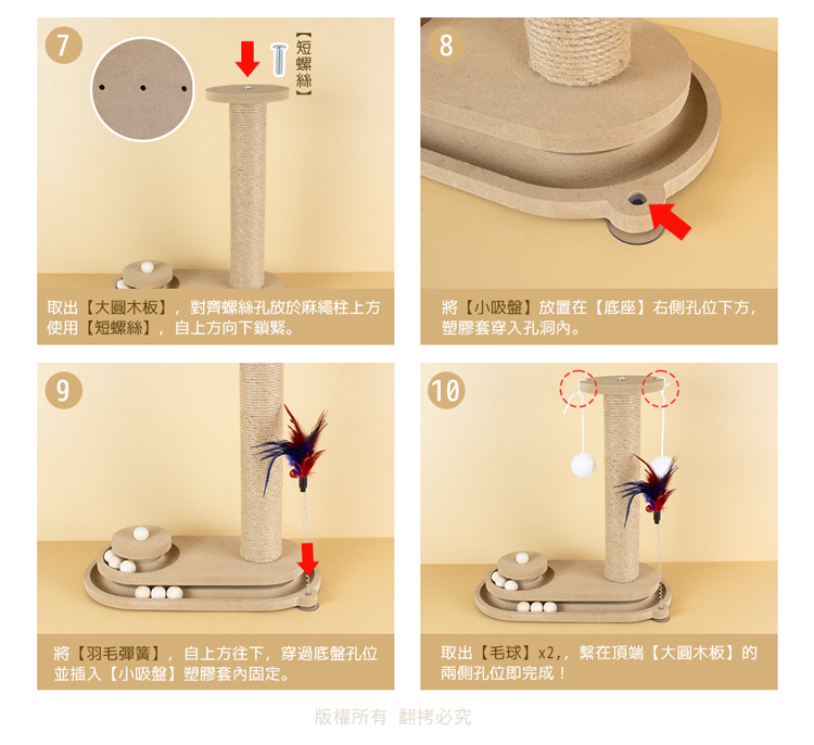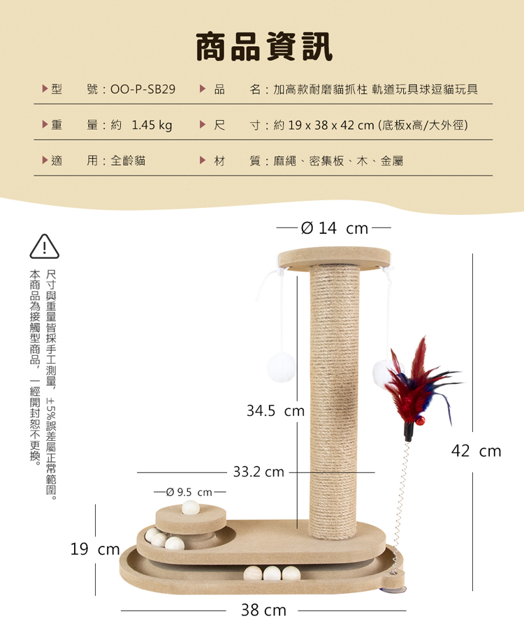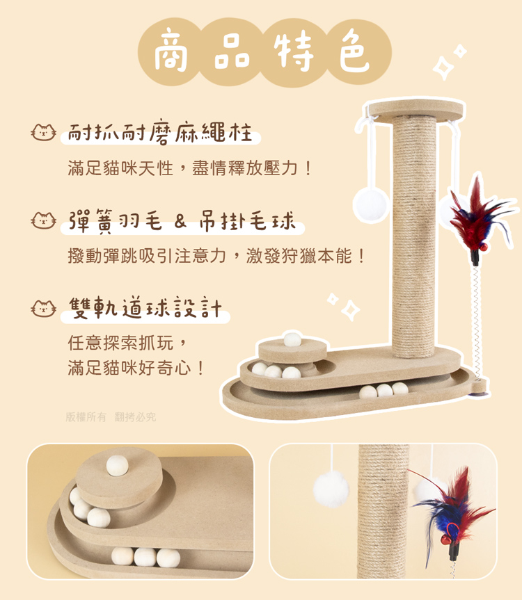 貓本屋 加高款耐磨貓抓柱 軌道玩具球逗貓玩具 --耐抓麻繩柱+軌道球+彈簧羽毛+吊掛毛球,貓咪的最佳玩伴-- 高密度麻繩柱,滿足貓咪磨爪天性,磨磨小爪子。軌道球設計,讓貓咪自由探索抓玩,好奇心爆發!彈簧羽毛+吊掛毛球,輕鬆吸引目光,激發狩獵本能! 採用密集板設計,結構緊密牢固耐用!一款集磨抓、玩樂、運動於一身的多功能玩具,立刻打造貓咪專屬的快樂遊戲台! ※請避免潮濕環境與液體接觸,以免材質受潮而損壞。注意事項: .玩具毛球與羽毛,顏色為隨機搭配!.本商品為接觸型商品,為避免傳染性疾病(如:跳蚤/壁蝨/疥癬…等) 一經開封或試用過,恕不接受更換事宜。.請遠離高溫源(如:暖氣、火爐…等),以免不慎點燃。.請避免放置於水源或潮濕的環境中,避免密集板受潮。.本產品僅供寵物使用,請勿用作其他用途。.購買前,請仔細閱讀商品的規格與尺寸,謹慎購買,以免造成日後買賣糾紛。.商品圖檔的顏色因電腦螢幕設定的差異可能會有所不同,請以實際商品顏色為準。.尺寸與重量皆採手工測量,±5%誤差屬正常範圍。 轉載敬告: 鈞嵐(立嵐)之商品圖文、影片或商標等,皆屬鈞嵐(立嵐)版權所有, 若未經同意即任意轉載刊登者,我司將進行相關智慧財產著作權與 商標權及商業法的追訴權利。 商品規格: .型 號:OO-P-SB29 .品 名:貓本屋 加高款耐磨貓抓柱 軌道玩具球逗貓玩具.尺 寸:約 19 x 38 x 42 cm (±5%/最大外徑).重 量:約 1.45 kg (±5%).材 質:麻繩、密集板、木頭、金屬.隨附配件:底座 x1、中隔板 x1、圓木板(大) x1、圓木板(中) x1、 圓木板(小) x3、木頭球(無孔)x6、木頭球(有孔)x1、 螺絲(長) x1、螺絲(中) x1、、螺絲(短) x1、小吸盤 x1 羽毛彈簧 x1、毛球 x2.商品保固:僅限新品瑕疵更可換商品.產 地:中國大陸