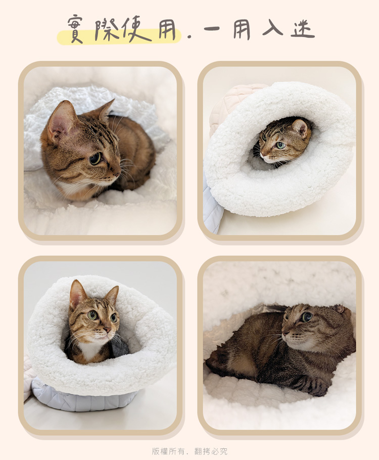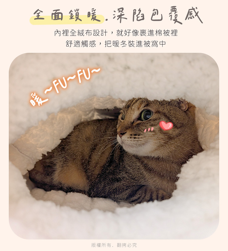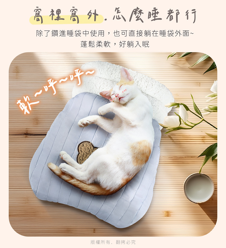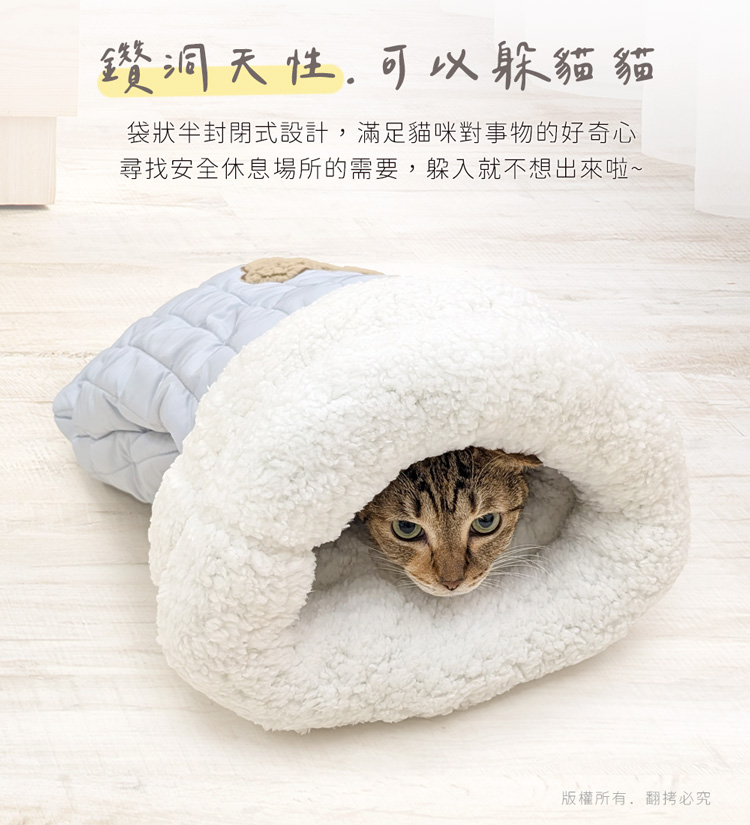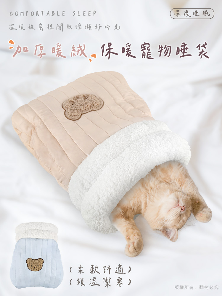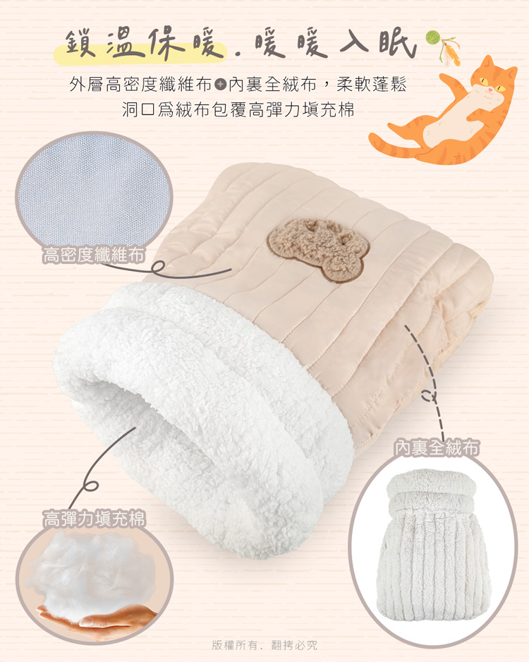 貓本屋 加厚暖絨保暖寵物睡袋 ★內裡全絨舒適臥躺★ --舒服臥躺,躲入其中,進窩就不想離開了-- 袋狀半封閉式設計,符合貓主子喜歡隱閉空間的喜好,主子能自在伸展或蜷縮入眠,給予滿滿的安全感與包覆感。 適用於幼犬、小型犬、8kg以下全齡貓!外層採用高密度纖維布,有效鎖暖禦寒,內裡為全絨毛布包覆,柔軟保暖材質,觸感舒適,洞口使用絨毛布搭配高彈力填充棉,Q彈軟綿! 可直接躲入袋中,安穩入眠,也可直接躺於睡袋上,做為睡墊使用兼具美觀、實用與便利的寵物保暖睡袋~