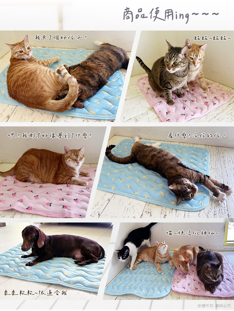 貓本屋 涼感降溫冰絲寵物涼墊(L號/68x54cm)★貓狗適用★ --溫和且迅速降溫,涼爽舒適,告別黏膩!-- 炎炎夏日,擔心冷氣費貴、更怕獨自留在家中的毛孩們太熱!尤其毛小孩的體溫又比人略高,除了通風的環境、提供充足的水份之外還能提供什麼避暑良方呢? 【涼感降溫冰絲寵物涼墊】,採用冰絲涼感面料,皮膚接觸這種面料,會感到冰涼滑順,夏天不再擔心毛小孩太熱,不用吹冷氣也可以涼涼的!絕對是今年夏天的不二選擇! 安全無害印染,可愛水果圖案搭配雙色印刷,打造溫馨美感!可直接放置於寵物窩、籠子、地板、沙發上…等,趕快使用降溫墊,讓毛小孩擁有一個涼爽的休憩環境吧! ※請避免使用尖銳物割刺、或是寵物啃咬,以免造成破損。※若沾染髒污時,請立即使用濕布擦拭,避免長時間滲透! 注意事項: .本商品為接觸型商品,為避免傳染性疾病(如:跳蚤/壁虱/疥癬…等) 一經開封或試用過,恕不受理更換事宜。.本產品僅供寵物使用,請勿做其他用途。.若於溫度35℃以上的環境使用,可搭配電扇或空調,可提高使用效果。.收納存放時,請放置於陰涼乾燥處,請避免靠近火源/高溫/陽光直射。.欲清理時,可直接水洗,並搭配中性潔劑,清洗完畢時直接陰乾。.請避免使用尖銳物割刺、或是寵物啃咬,以免造成布面破損。.商品圖檔顏色因電腦螢幕設定差異會略有不同,以實際商品顏色為準。.購買前仔細詳閱商品規格尺寸,慎重購買,以免造成日後買賣糾紛。.所有的規格與重量皆採手工測量,誤差±5%屬正常範圍。 轉載警示: 自民國108年6月1日起(含追溯既往),鈞嵐(立嵐)企業有限公司之 商品圖片、影片或鈞嵐(立嵐)企業有限公司文字及LOGO, 任何客戶或用戶需轉載刊登任何圖片、文字、影片 皆需經過鈞嵐(立嵐)書面同意,如有需求請與鈞嵐(立嵐)客服中心接洽聯絡。 若任何未經鈞嵐(立嵐)同意即任意轉載刊登者, 我司將進行相關智慧財產著作權與商標權及商業法的追訴權利。 商品規格: .型 號:OO-P-SN05L.品 名:貓本屋 涼感降溫冰絲寵物涼墊.款 式:藍色香蕉/粉紅桃子.尺 寸:約 68 x 54 cm.重 量:約 146.5 g.材 質:涼感布、填充棉、防滑顆粒.包裝方式:袋裝.包裝內含:冰絲寵物涼墊 x1.商品保固:僅限新品瑕疪更可換商品.產 地:中國大陸