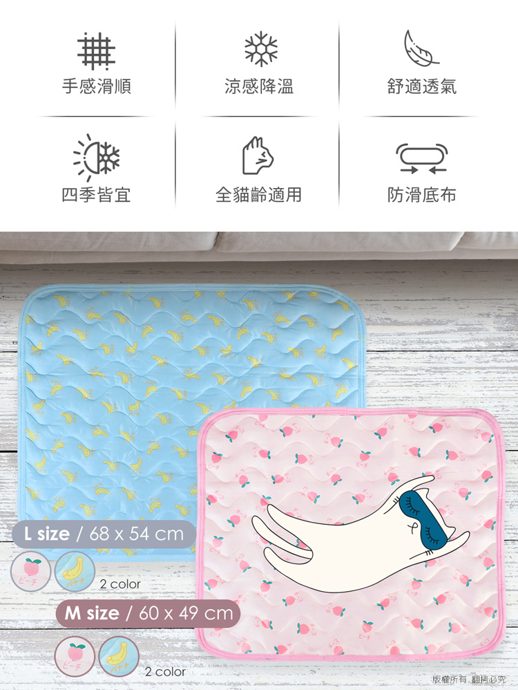 貓本屋 涼感降溫冰絲寵物涼墊(M號/60x49cm)★貓狗適用★ --溫和且迅速降溫,涼爽舒適,告別黏膩!-- 炎炎夏日,擔心冷氣費貴、更怕獨自留在家中的毛孩們太熱!尤其毛小孩的體溫又比人略高,除了通風的環境、提供充足的水份之外還能提供什麼避暑良方呢? 【涼感降溫冰絲寵物涼墊】,採用冰絲涼感面料,皮膚接觸這種面料,會感到冰涼滑順,夏天不再擔心毛小孩太熱,不用吹冷氣也可以涼涼的!絕對是今年夏天的不二選擇! 安全無害印染,可愛水果圖案搭配雙色印刷,打造溫馨美感!可直接放置於寵物窩、籠子、地板、沙發上…等,趕快使用降溫墊,讓毛小孩擁有一個涼爽的休憩環境吧! ※請避免使用尖銳物割刺、或是寵物啃咬,以免造成破損。※若沾染髒污時,請立即使用濕布擦拭,避免長時間滲透! 注意事項: .本商品為接觸型商品,為避免傳染性疾病(如:跳蚤/壁虱/疥癬…等) 一經開封或試用過,恕不受理更換事宜。.本產品僅供寵物使用,請勿做其他用途。.若於溫度35℃以上的環境使用,可搭配電扇或空調,可提高使用效果。.收納存放時,請放置於陰涼乾燥處,請避免靠近火源/高溫/陽光直射。.欲清理時,可直接水洗,並搭配中性潔劑,清洗完畢時直接陰乾。.請避免使用尖銳物割刺、或是寵物啃咬,以免造成布面破損。.商品圖檔顏色因電腦螢幕設定差異會略有不同,以實際商品顏色為準。.購買前仔細詳閱商品規格尺寸,慎重購買,以免造成日後買賣糾紛。.所有的規格與重量皆採手工測量,誤差±5%屬正常範圍。 轉載警示: 自民國108年6月1日起(含追溯既往),鈞嵐(立嵐)企業有限公司之 商品圖片、影片或鈞嵐(立嵐)企業有限公司文字及LOGO, 任何客戶或用戶需轉載刊登任何圖片、文字、影片 皆需經過鈞嵐(立嵐)書面同意,如有需求請與鈞嵐(立嵐)客服中心接洽聯絡。 若任何未經鈞嵐(立嵐)同意即任意轉載刊登者, 我司將進行相關智慧財產著作權與商標權及商業法的追訴權利。 商品規格: .型 號:OO-P-SN05M.品 名:貓本屋 涼感降溫冰絲寵物涼墊.款 式:藍色香蕉/粉紅桃子.尺 寸:約 60 x 49 cm.重 量:約 136.6 g.材 質:涼感布、填充棉、防滑顆粒.包裝方式:袋裝.包裝內含:冰絲寵物涼墊 x1.商品保固:僅限新品瑕疪更可換商品.產 地:中國大陸