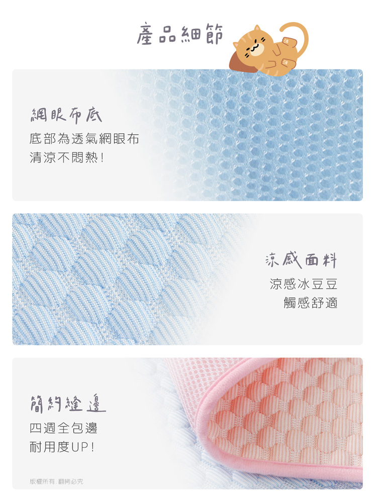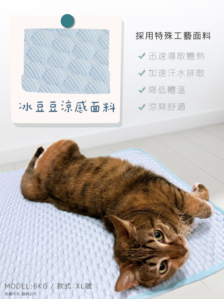 貓本屋 冰豆豆涼感寵物墊(L號/60x50cm)★貓狗適用★ --溫和且迅速降溫,涼爽舒適,告別黏膩!-- 炎炎夏日,擔心冷氣費貴、更怕獨自留在家中的毛孩們太熱!尤其毛小孩的體溫又比人略高,除了通風的環境、提供充足的水份之外還能提供什麼避暑良方呢? 【冰豆豆涼感寵物墊】,採用冰豆豆涼感冰絲面料,皮膚接觸這種面料,會感到冰涼滑順,夏天不再擔心毛小孩太熱,不用吹冷氣也可以涼涼的!絕對是今年夏天的不二選擇! 可直接放置於寵物窩、籠子、地板、沙發上…等,趕快使用降溫墊,讓毛小孩擁有一個涼爽的休憩環境吧! ※請避免使用尖銳物割刺、或是寵物啃咬,以免造成破損。※若沾染髒污時,請立即使用濕布擦拭,避免長時間滲透!※若於溫度35℃以上的環境使用,可搭配電扇或空調,可提高使用效果。注意事項: .本商品為接觸型商品,為避免傳染性疾病(如:跳蚤/壁虱/疥癬…等) 一經開封或試用過,恕不受理更換事宜。.本產品僅供寵物使用,請勿做其他用途。.若於溫度35℃以上的環境使用,可搭配電扇或空調,可提高使用效果。.收納存放時,請放置於陰涼乾燥處,請避免靠近火源/高溫/陽光直射。.欲清理時,可直接水洗,並搭配中性潔劑,清洗完畢時直接陰乾。.請避免使用尖銳物割刺、或是寵物啃咬,以免造成布面破損。.商品圖檔顏色因電腦螢幕設定差異會略有不同,以實際商品顏色為準。.購買前仔細詳閱商品規格尺寸,慎重購買,以免造成日後買賣糾紛。.所有的規格與重量皆採手工測量,誤差±5%屬正常範圍。 轉載敬告: 鈞嵐(立嵐)之商品圖文、影片或商標等,皆屬鈞嵐(立嵐)版權所有, 若未經同意即任意轉載刊登者,我司將進行相關智慧財產著作權與 商標權及商業法的追訴權利。 商品規格: .型 號:OO-P-SN06L.品 名:貓本屋 冰豆豆涼感寵物墊(L號).款 式:粉藍/粉紅.尺 寸:約 60 x 50 cm .重 量:約 197 g.材 質:涼感布、填充棉、網眼布.包裝方式:袋裝.包裝內含:冰豆豆涼感寵物墊 x1.商品保固:僅限新品瑕疵更可換商品.產 地:中國大陸