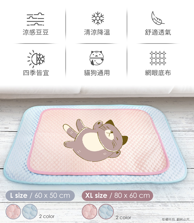 貓本屋 冰豆豆涼感寵物墊(XL號/80x60cm)★貓狗適用★ --溫和且迅速降溫,涼爽舒適,告別黏膩!-- 炎炎夏日,擔心冷氣費貴、更怕獨自留在家中的毛孩們太熱!尤其毛小孩的體溫又比人略高,除了通風的環境、提供充足的水份之外還能提供什麼避暑良方呢? 【冰豆豆涼感寵物墊】,採用冰豆豆涼感冰絲面料,皮膚接觸這種面料,會感到冰涼滑順,夏天不再擔心毛小孩太熱,不用吹冷氣也可以涼涼的!絕對是今年夏天的不二選擇! 可直接放置於寵物窩、籠子、地板、沙發上…等,趕快使用降溫墊,讓毛小孩擁有一個涼爽的休憩環境吧! ※請避免使用尖銳物割刺、或是寵物啃咬,以免造成破損。※若沾染髒污時,請立即使用濕布擦拭,避免長時間滲透!※若於溫度35℃以上的環境使用,可搭配電扇或空調,可提高使用效果。注意事項: .本商品為接觸型商品,為避免傳染性疾病(如:跳蚤/壁虱/疥癬…等) 一經開封或試用過,恕不受理更換事宜。.本產品僅供寵物使用,請勿做其他用途。.若於溫度35℃以上的環境使用,可搭配電扇或空調,可提高使用效果。.收納存放時,請放置於陰涼乾燥處,請避免靠近火源/高溫/陽光直射。.欲清理時,可直接水洗,並搭配中性潔劑,清洗完畢時直接陰乾。.請避免使用尖銳物割刺、或是寵物啃咬,以免造成布面破損。.商品圖檔顏色因電腦螢幕設定差異會略有不同,以實際商品顏色為準。.購買前仔細詳閱商品規格尺寸,慎重購買,以免造成日後買賣糾紛。.所有的規格與重量皆採手工測量,誤差±5%屬正常範圍。 轉載敬告: 鈞嵐(立嵐)之商品圖文、影片或商標等,皆屬鈞嵐(立嵐)版權所有, 若未經同意即任意轉載刊登者,我司將進行相關智慧財產著作權與 商標權及商業法的追訴權利。 商品規格: .型 號:OO-P-SN06XL.品 名:貓本屋 冰豆豆涼感寵物墊.款 式:粉藍/粉紅.尺 寸:約 80 x 60 cm .重 量:約 304 g.材 質:涼感布、填充棉、網眼布.包裝方式:袋裝.包裝內含:冰豆豆涼感寵物墊 x1.商品保固:僅限新品瑕疵更可換商品.產 地:中國大陸