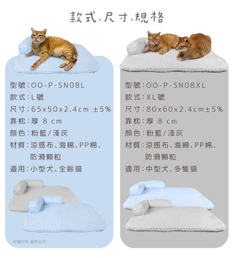 貓本屋 冰豆豆涼感 可拆洗靠枕寵物睡墊(XL號/80x60cm)★貓狗適用★ --溫和迅速降溫,涼爽舒適,告別黏膩!-- 炎炎夏日,擔心冷氣費貴、更怕獨自留在家中的毛孩們太熱!尤其毛小孩的體溫又比人略高,除了通風的環境、提供充足的水份之外還能提供什麼避暑良方呢? 【冰豆豆涼感 可拆洗靠枕寵物睡墊】,採用冰豆豆涼感冰絲面料,皮膚接觸這種面料,會感到冰涼滑順,夏天不再擔心毛小孩太熱,不用吹冷氣也可以涼涼的!絕對是今年夏天的不二選擇! 底部海綿墊可拆出,方便清洗易打理!L型靠枕內部填充高回彈的PP棉,如雲朵般蓬鬆柔軟,舒爽靠著睡,可放置於籠子、推車、地板、沙發上…等,趕快使用降溫墊,讓毛小孩擁有一個涼爽的休憩環境吧! ※欲清理時,請先將底部的海綿墊取出,使用溫水手洗, 並搭配中性潔劑,清洗完畢後請放至通風處晾乾即可!※請避免使用尖銳物割刺、或是寵物啃咬,以免造成破損。※若沾染髒污時,請立即使用濕布擦拭,避免長時間滲透!※本產品不可漂白、不可熨燙、不可烘乾!注意事項: .本商品為接觸型商品,為避免傳染性疾病(如:跳蚤/壁蝨/疥癬…等) 一經開封或試用過,恕不受理更換事宜。.本產品僅供寵物使用,請勿做其他用途。.若於溫度35℃以上的環境使用,可搭配電扇或空調,可提高使用效果。.收納存放時,請放置於陰涼乾燥處,請避免靠近火源/高溫/陽光直射。.欲清理時,可直接水洗,並搭配中性潔劑,清洗完畢時直接陰乾。.請避免使用尖銳物割刺、或是寵物啃咬,以免造成布面破損。.商品圖檔顏色因電腦螢幕設定差異會略有不同,以實際商品顏色為準。.購買前仔細詳閱商品規格尺寸,慎重購買,以免造成日後買賣糾紛。.所有的規格與重量皆採手工測量,誤差±5%屬正常範圍。 轉載敬告: 鈞嵐(立嵐)之商品圖文、影片或商標等,皆屬鈞嵐(立嵐)版權所有, 若未經同意即任意轉載刊登者,我司將進行相關智慧財產著作權與 商標權及商業法的追訴權利。 商品規格: .型 號:OO-P-SN08XL.品 名:貓本屋 冰豆豆涼感 可拆洗靠枕寵物睡墊(XL號).款 式:粉藍/淺灰.尺 寸:約 80 x 60 x 2.4 cm / 靠枕厚 8 cm.重 量:約 779 g.材 質:涼感布、海綿、PP棉、防滑顆粒.包裝方式:袋裝.包裝內含:冰豆豆涼感寵物睡墊 x1.商品保固:僅限新品瑕疪更可換商品.產 地:中國大陸