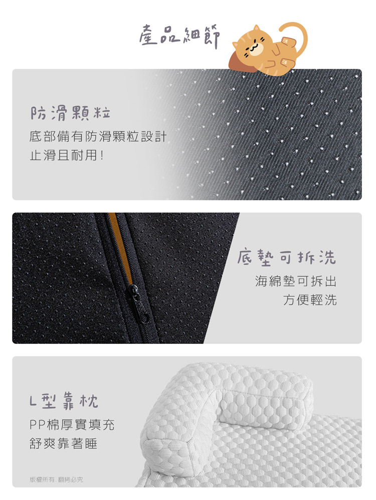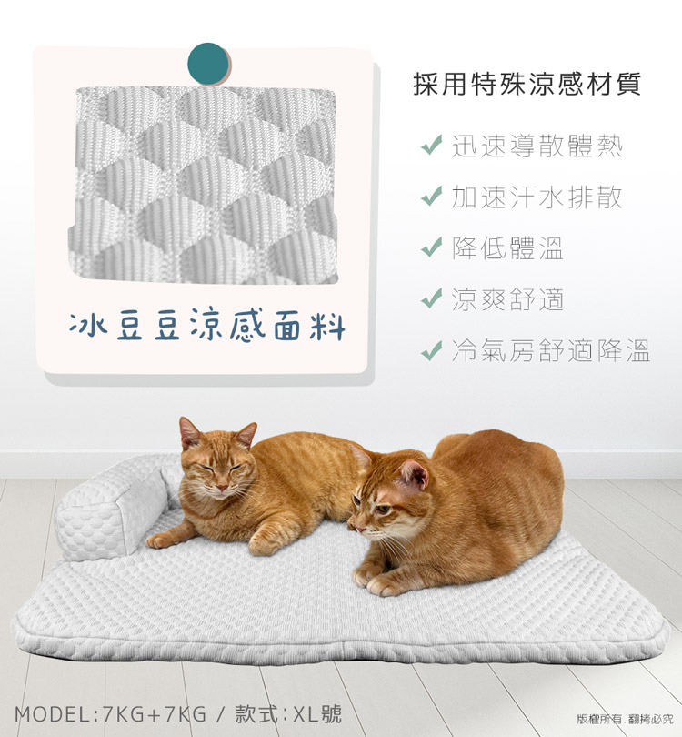 貓本屋 冰豆豆涼感 可拆洗靠枕寵物睡墊(XL號/80x60cm)★貓狗適用★ --溫和迅速降溫,涼爽舒適,告別黏膩!-- 炎炎夏日,擔心冷氣費貴、更怕獨自留在家中的毛孩們太熱!尤其毛小孩的體溫又比人略高,除了通風的環境、提供充足的水份之外還能提供什麼避暑良方呢? 【冰豆豆涼感 可拆洗靠枕寵物睡墊】,採用冰豆豆涼感冰絲面料,皮膚接觸這種面料,會感到冰涼滑順,夏天不再擔心毛小孩太熱,不用吹冷氣也可以涼涼的!絕對是今年夏天的不二選擇! 底部海綿墊可拆出,方便清洗易打理!L型靠枕內部填充高回彈的PP棉,如雲朵般蓬鬆柔軟,舒爽靠著睡,可放置於籠子、推車、地板、沙發上…等,趕快使用降溫墊,讓毛小孩擁有一個涼爽的休憩環境吧! ※欲清理時,請先將底部的海綿墊取出,使用溫水手洗, 並搭配中性潔劑,清洗完畢後請放至通風處晾乾即可!※請避免使用尖銳物割刺、或是寵物啃咬,以免造成破損。※若沾染髒污時,請立即使用濕布擦拭,避免長時間滲透!※本產品不可漂白、不可熨燙、不可烘乾!注意事項: .本商品為接觸型商品,為避免傳染性疾病(如:跳蚤/壁蝨/疥癬…等) 一經開封或試用過,恕不受理更換事宜。.本產品僅供寵物使用,請勿做其他用途。.若於溫度35℃以上的環境使用,可搭配電扇或空調,可提高使用效果。.收納存放時,請放置於陰涼乾燥處,請避免靠近火源/高溫/陽光直射。.欲清理時,可直接水洗,並搭配中性潔劑,清洗完畢時直接陰乾。.請避免使用尖銳物割刺、或是寵物啃咬,以免造成布面破損。.商品圖檔顏色因電腦螢幕設定差異會略有不同,以實際商品顏色為準。.購買前仔細詳閱商品規格尺寸,慎重購買,以免造成日後買賣糾紛。.所有的規格與重量皆採手工測量,誤差±5%屬正常範圍。 轉載敬告: 鈞嵐(立嵐)之商品圖文、影片或商標等,皆屬鈞嵐(立嵐)版權所有, 若未經同意即任意轉載刊登者,我司將進行相關智慧財產著作權與 商標權及商業法的追訴權利。 商品規格: .型 號:OO-P-SN08XL.品 名:貓本屋 冰豆豆涼感 可拆洗靠枕寵物睡墊(XL號).款 式:粉藍/淺灰.尺 寸:約 80 x 60 x 2.4 cm / 靠枕厚 8 cm.重 量:約 779 g.材 質:涼感布、海綿、PP棉、防滑顆粒.包裝方式:袋裝.包裝內含:冰豆豆涼感寵物睡墊 x1.商品保固:僅限新品瑕疪更可換商品.產 地:中國大陸