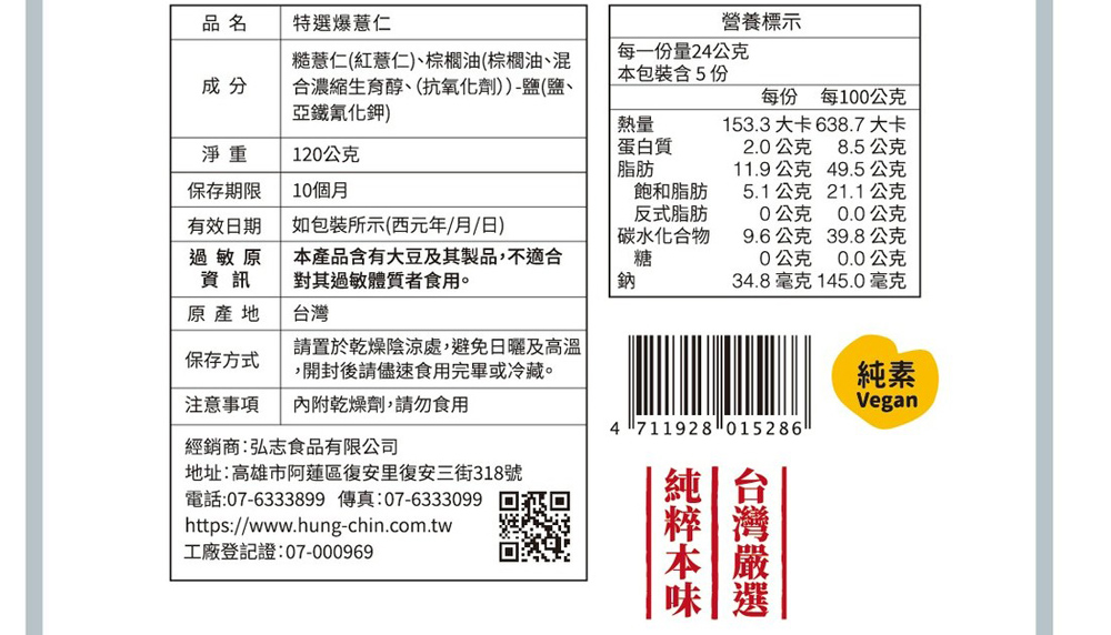 營養標示 每一份量100公克 熱量 588.3大卡 蛋白質 10公克 脂肪 35.5公克 飽和脂肪 1.84公克 反式脂肪 0公克 碳水化合物 57.2公克 鈉 18毫克