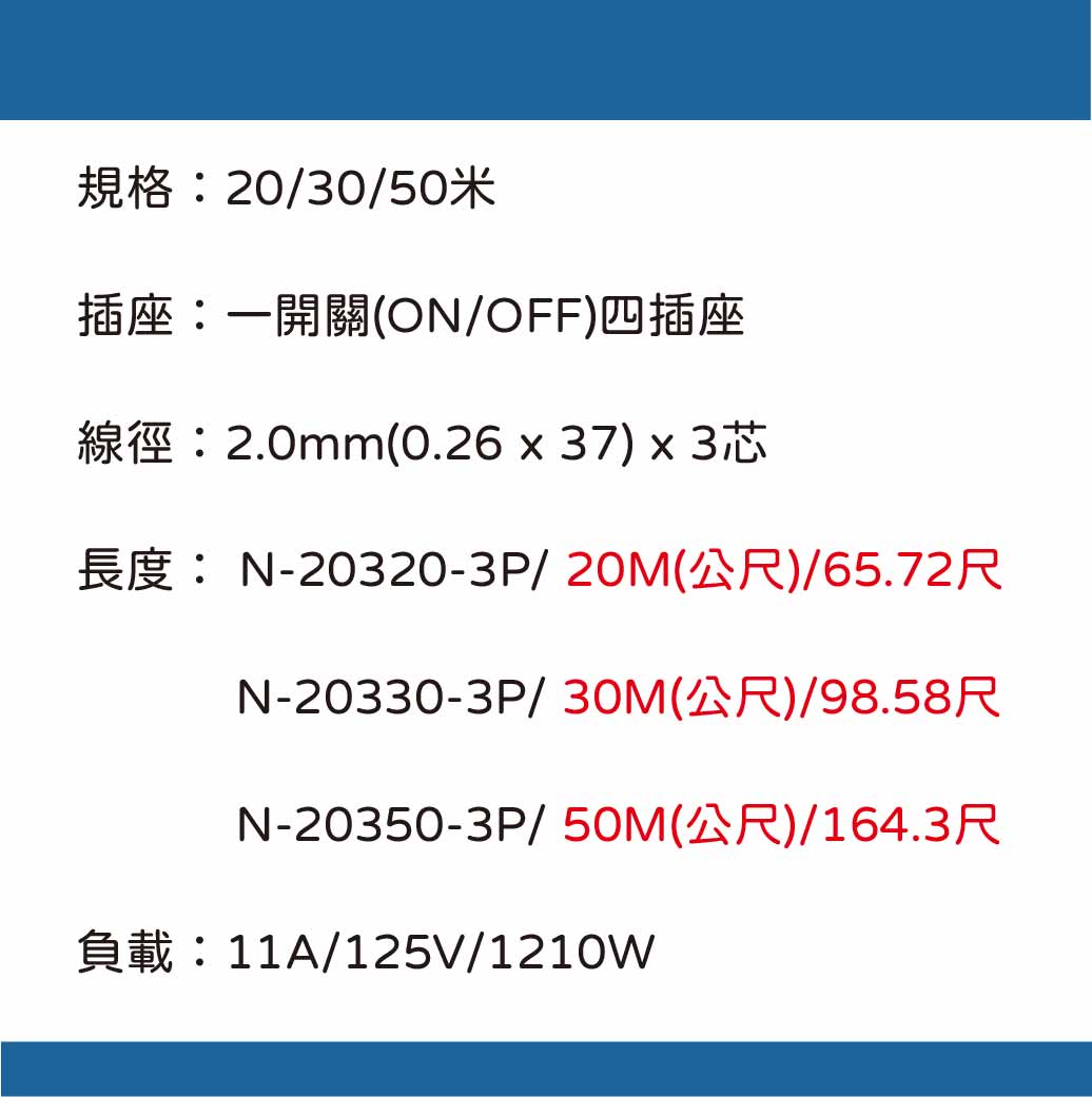 品 名:輪座動力線-(3芯2.0平方)規 格:20/30/50米插 座:一開關(ON/OFF)四插座線 徑:2.0mm(0.26 x 37) x 3芯長 度:20M(公尺) (N-20320-3P) 30M(公尺) (N-20330-3P) 50M(公尺) (N-20350-3P)負 載:11A/125V/1210W產 地:台灣