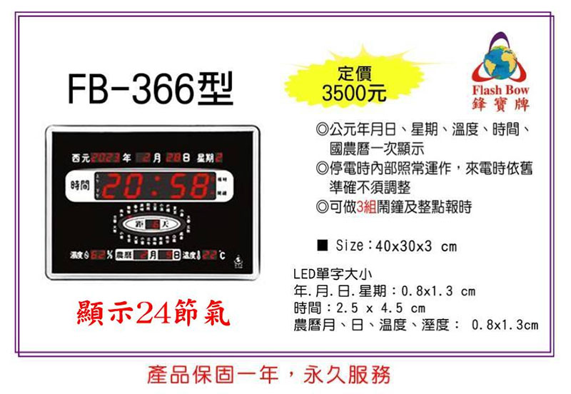 鋒寶牌 數字 電子鐘 萬年曆 橫式 40X30X3cm / 台 FB-366 (顯示24節氣)
