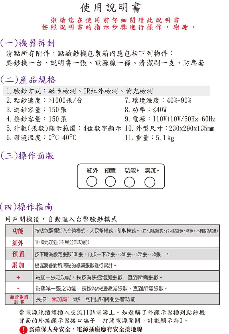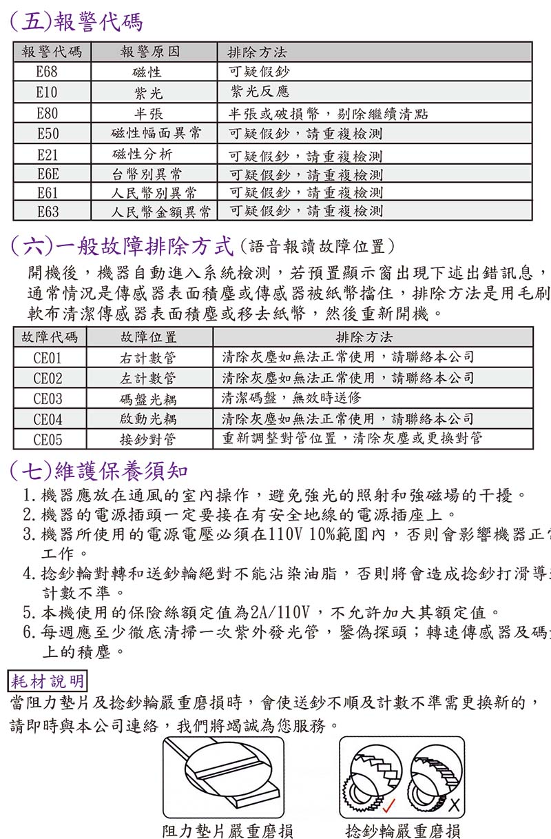 【商品規格】專業檢測:台幣、人民幣鑑偽功能:磁性檢驗/IR紅外線檢驗/紫光檢測功能: 台幣顯示面額張數語音讀報張數功能台幣、人民幣綜合檢驗、清點模式、可設定所需張數產品規格:點鈔速度:100張/6秒進鈔容量:150張計算顯示:1~9999張外型尺寸:23x29x16.5 cm整機重量:約5.1kg 廠商代號:Z11責任代號:QMW