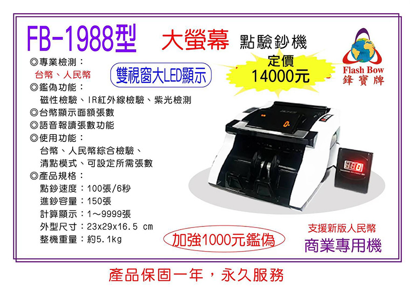 鋒寶牌 商業 專用機 雙視窗 LED顯示 點鈔機 驗鈔機 / 台 FB-1988 (台幣/人民幣)