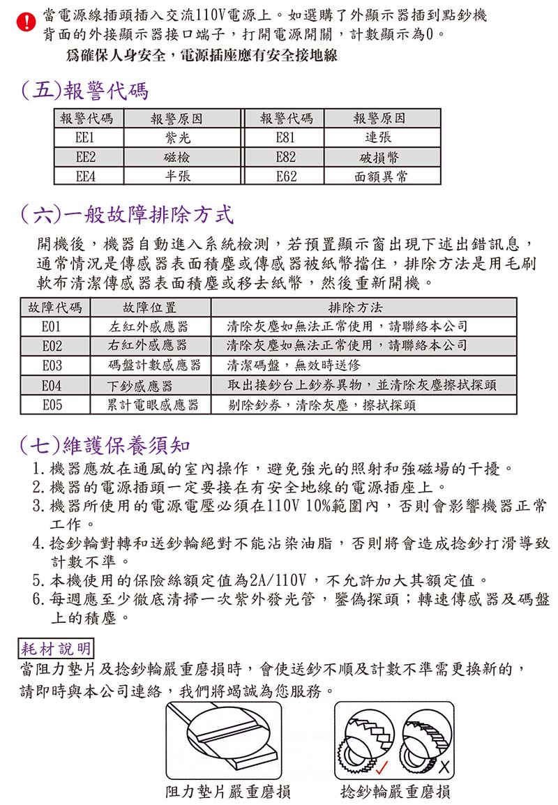 【商品規格】專業檢測:台幣鑑偽功能:IR紅外線檢驗/紫光檢測/6組紅外CB陣列(銀行等級專用5顆磁頭)功能: 台幣綜合檢驗清點模式、可設定所需張數三分鐘自動休眠裝置,節能省電加強1000元鑑偽產品規格:點鈔速度:100張/6秒進鈔容量:200張計算顯示:1~9999張外型尺寸:30x27x19 cm整機重量:約5.5kg 廠商代號:Z11責任代號:QMW